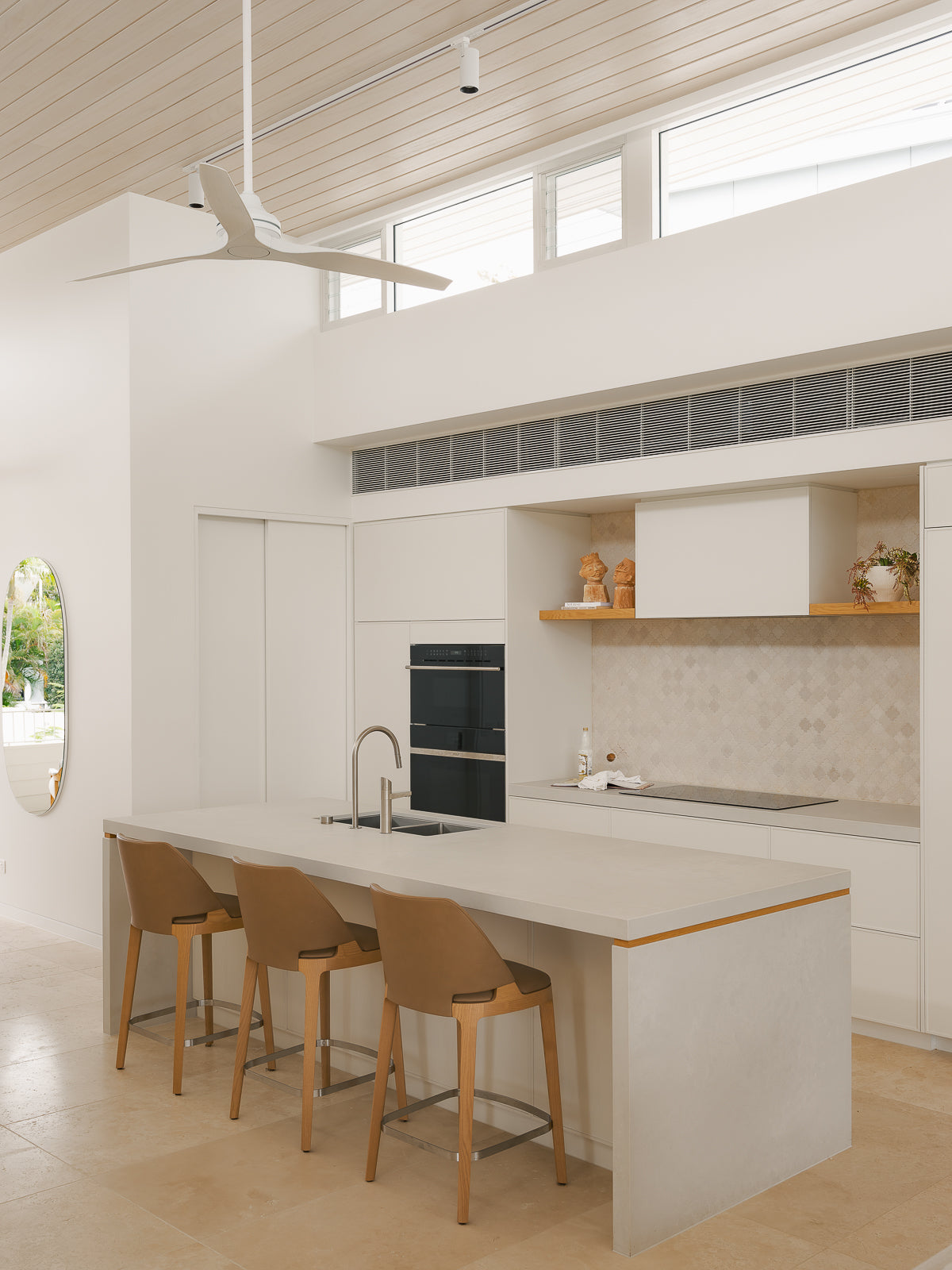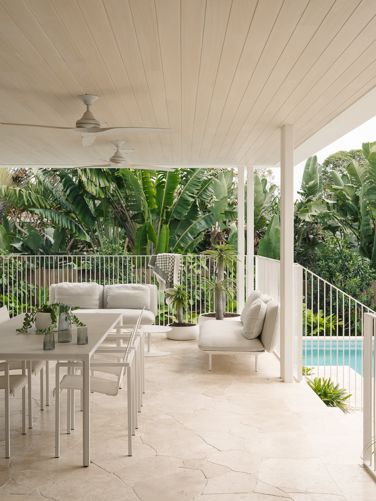 The outdoor spaces at Arkana House continue the home's cohesive design language, embracing a palette of crisp white and soft grey that complements the stone flooring and white façade of the covered patio. This restrained tonal approach sits beautifully against the lush, tropical greenery of Queensland’s landscape, creating a fresh, elevated backdrop for outdoor living.