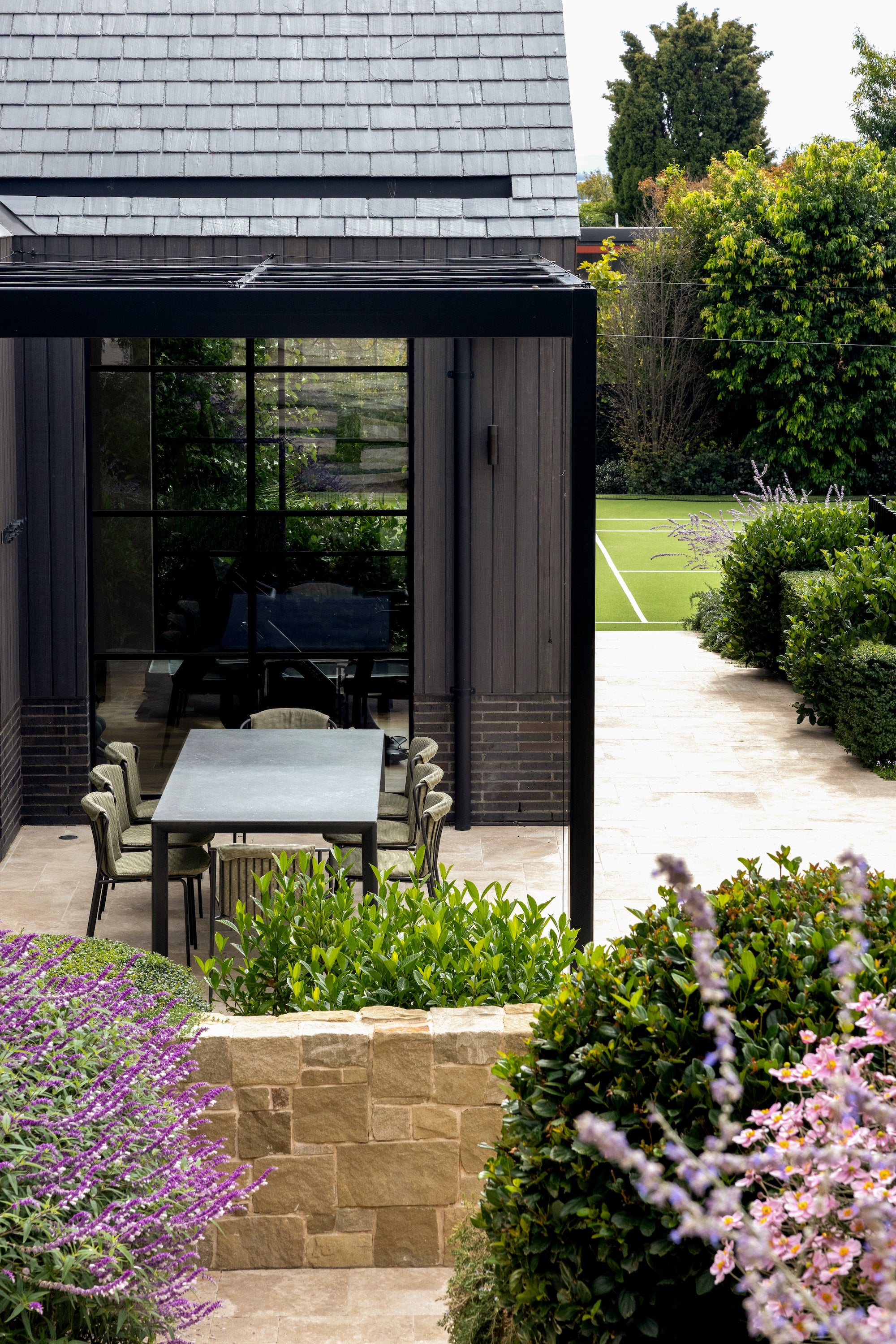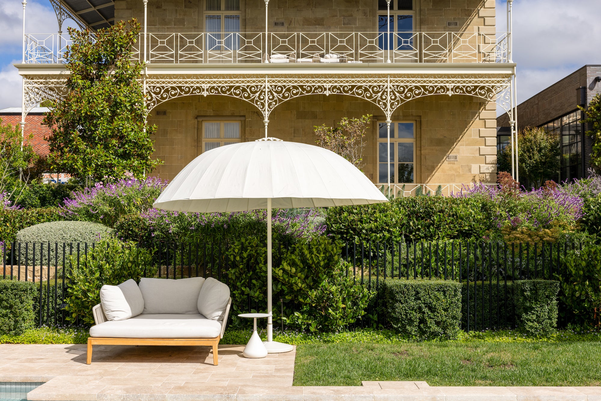 Kett’s Addis Bay collection was placed across the terrace, illustrating how modern outdoor forms can complement rather than compete with a heritage backdrop. The collection’s refined geometry, generous profiles and textured fabrics create a contemporary outdoor living environment that still respects the architectural rhythm of the home.