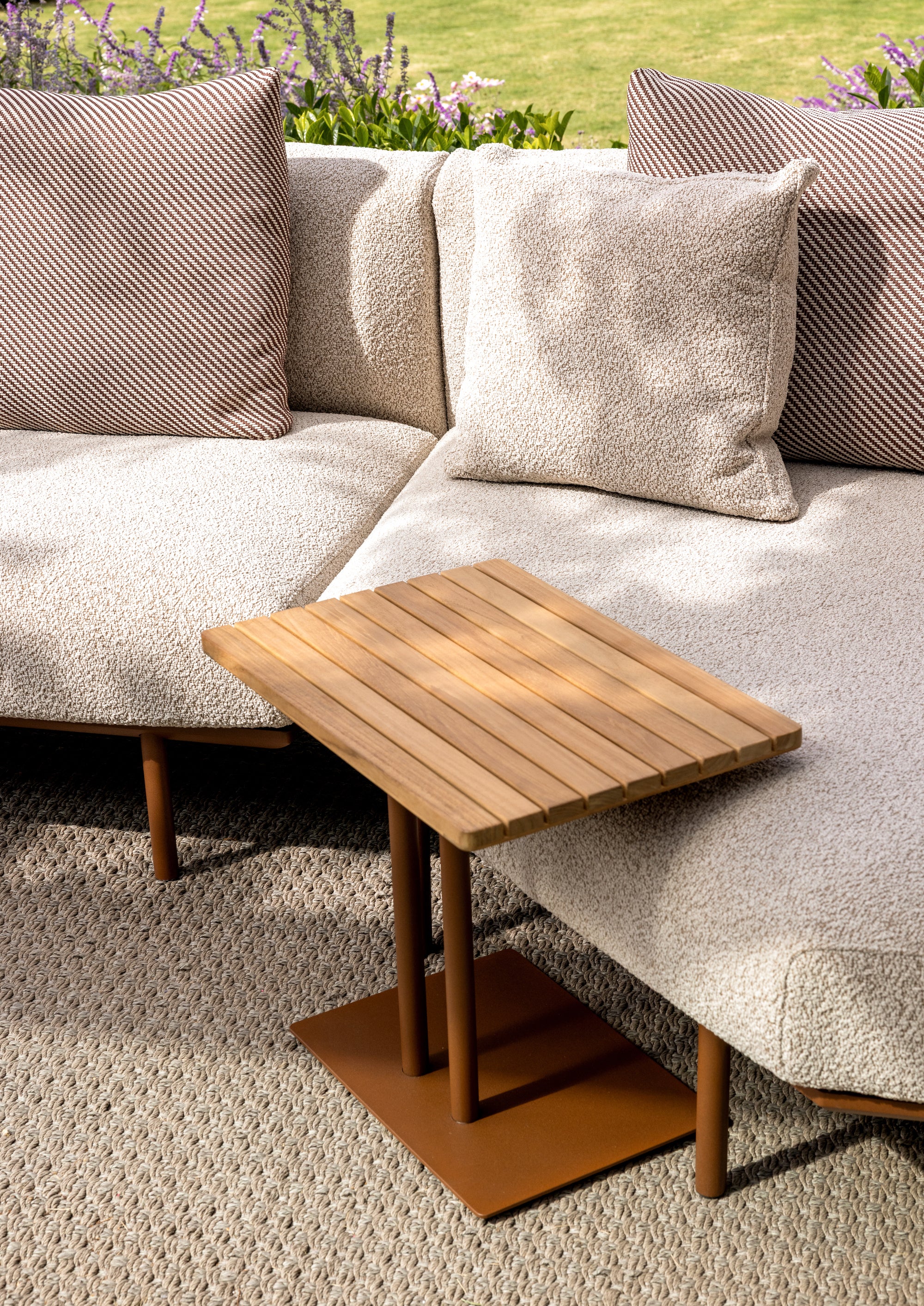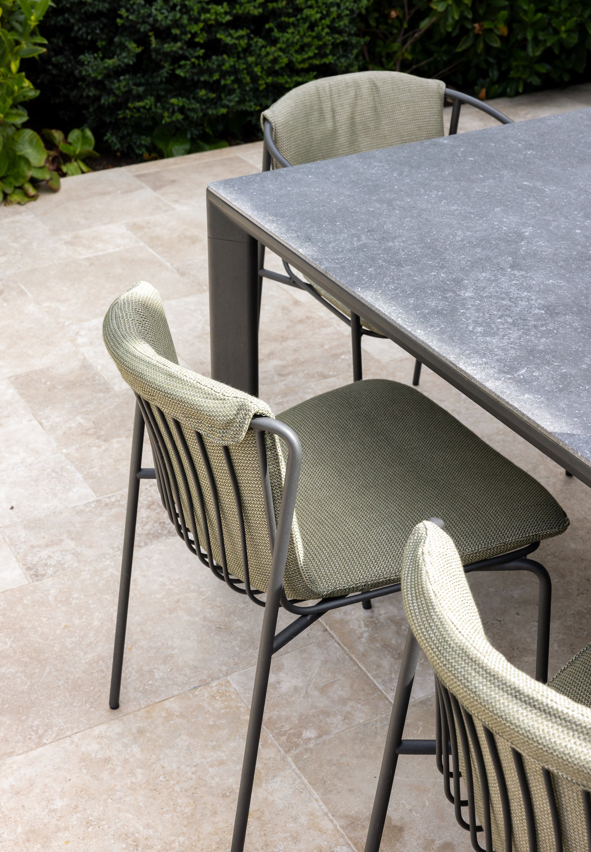 Earlier Kett designs including the Addis tables and Wye Side Chairs were integrated to demonstrate the continuity of the brand’s design language. Although developed at different times, the pieces share a cohesive approach to proportion, texture and materiality, reinforcing the idea that outdoor spaces can evolve gradually without compromising visual unity.