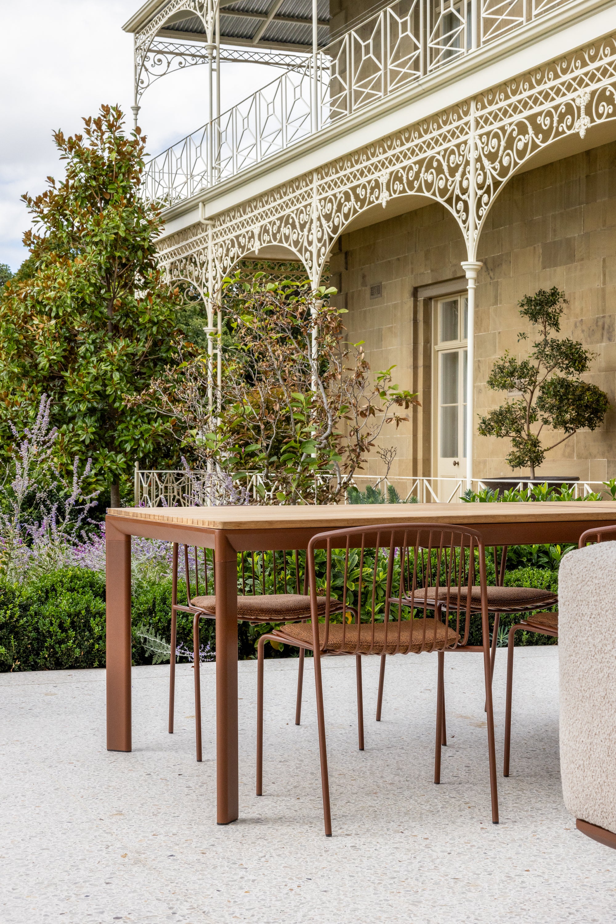 Kett's newest Ochre powder-coat finish provided a material link between the furniture and the existing architecture. Its warm, matte tonality sits quietly against the sandstone façade and surrounding garden, anchoring the pieces in place without imposing on the heritage character.