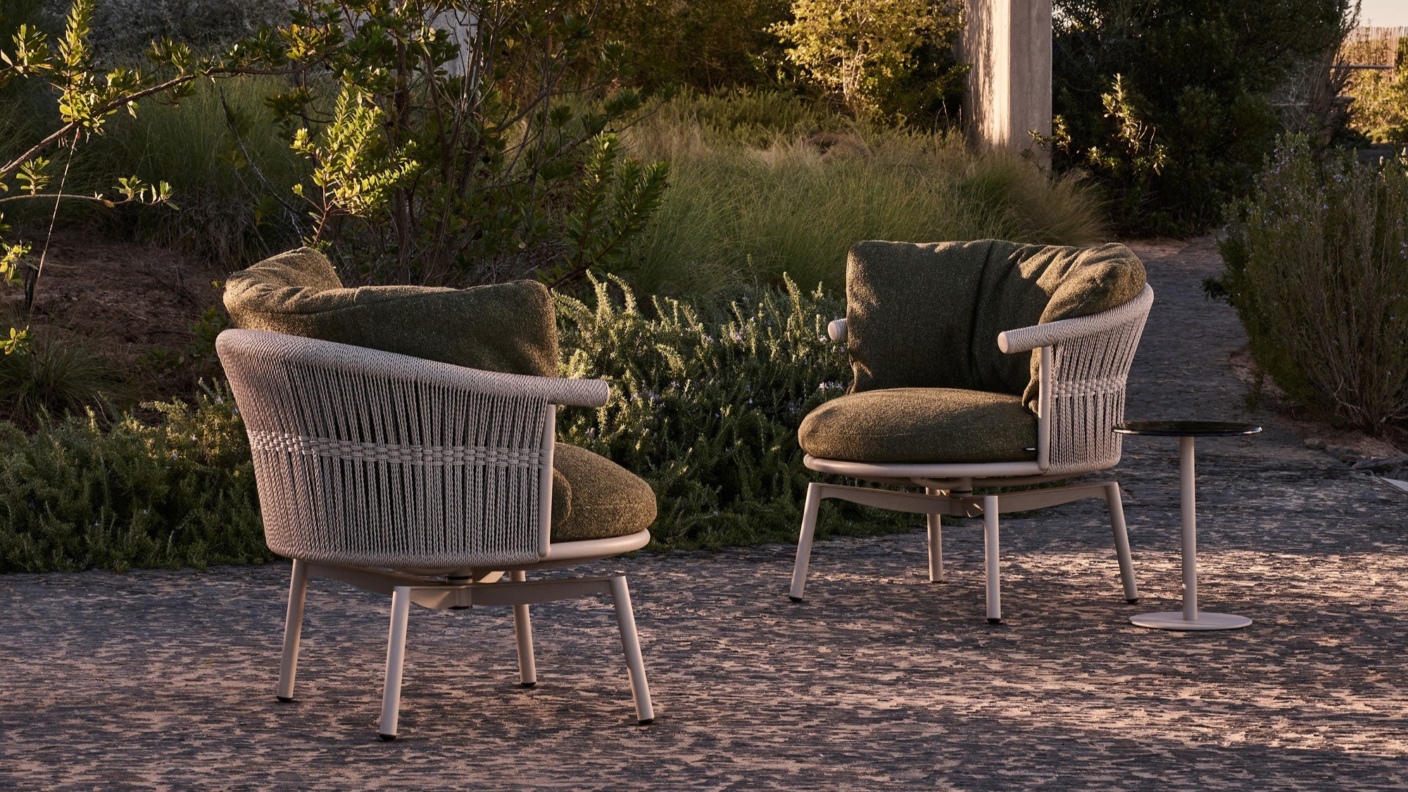 Cesta draws inspiration from traditional basket weaving—from ancient plaiting and coiling to modern interpretations designed for elevated outdoor living. Today’s artisans translate time-honoured techniques using durable aluminium and rope, merging heritage with innovation. Defined by clean lines and minimal adornment, CESTA’s woven backrest takes centre stage, balanced by plush cushioning and a sleek frame. A gentle side-to-side motion in the seat adds a quiet sense of ease and refinement.