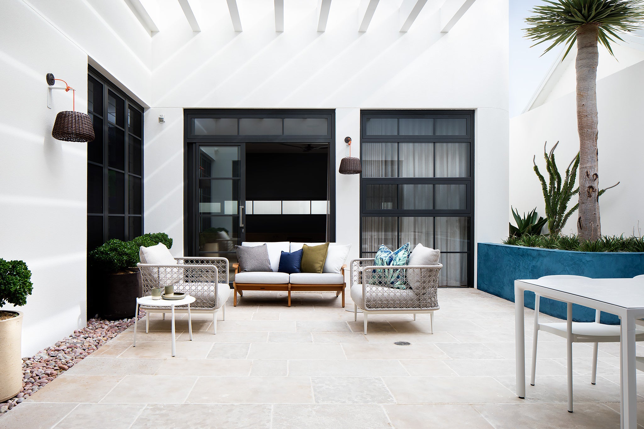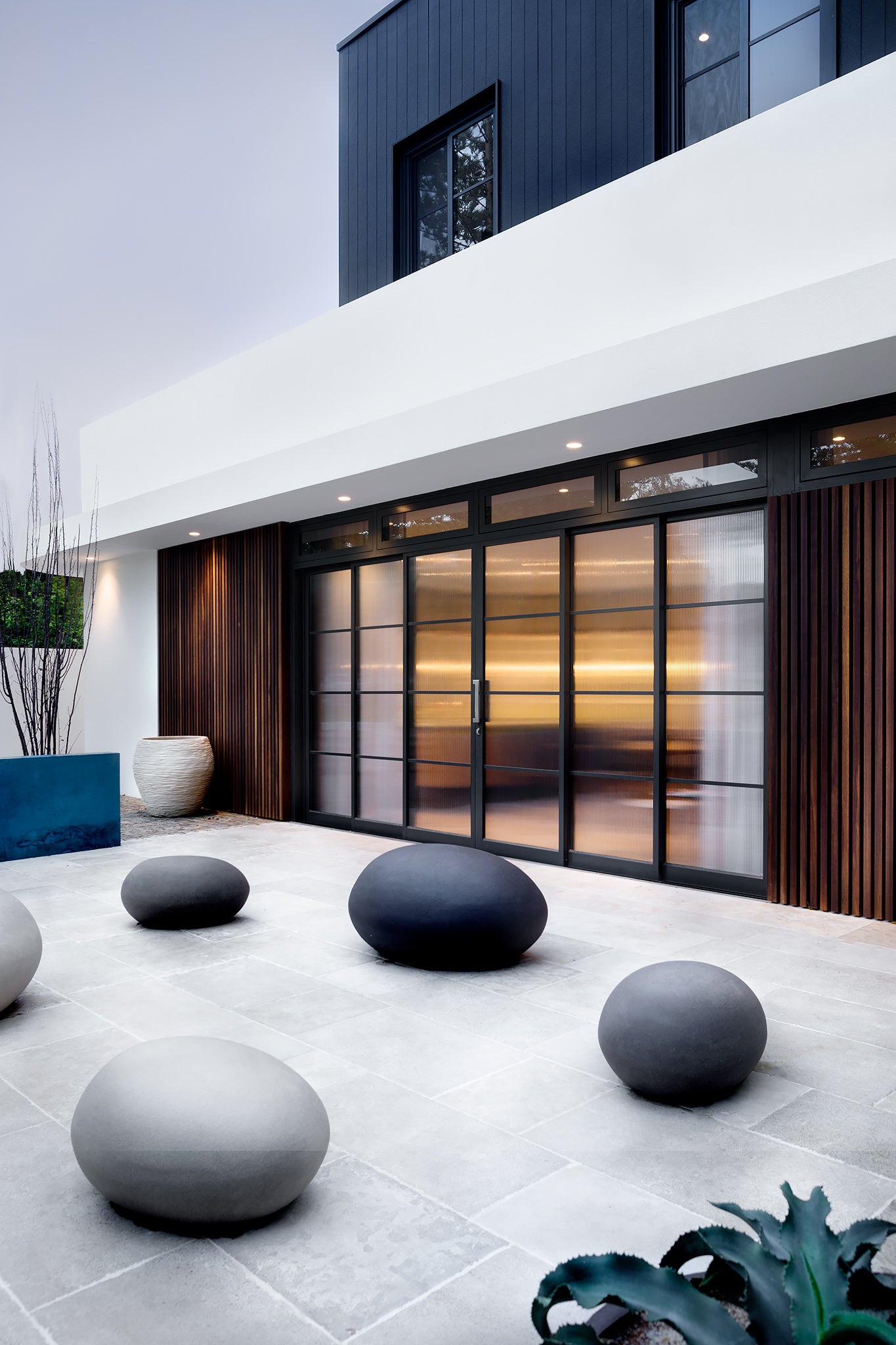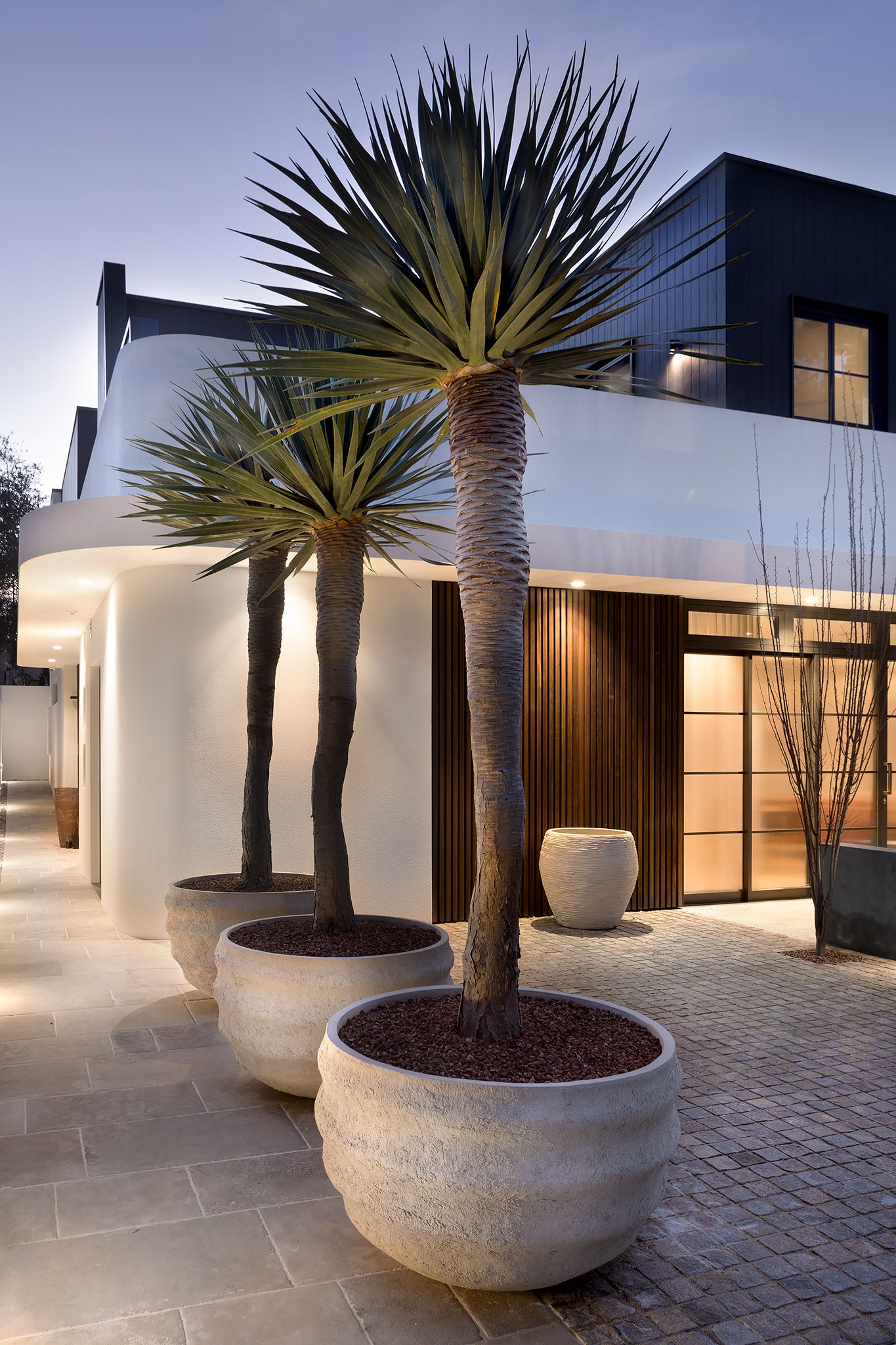 The client was after a sophisticated yet casual beach house, complete with unique garden and courtyard areas with bold features and things to see. The results speak for themselves, large-scale Atelier Vierkant planters and sculpture draw the eye in at every turn.