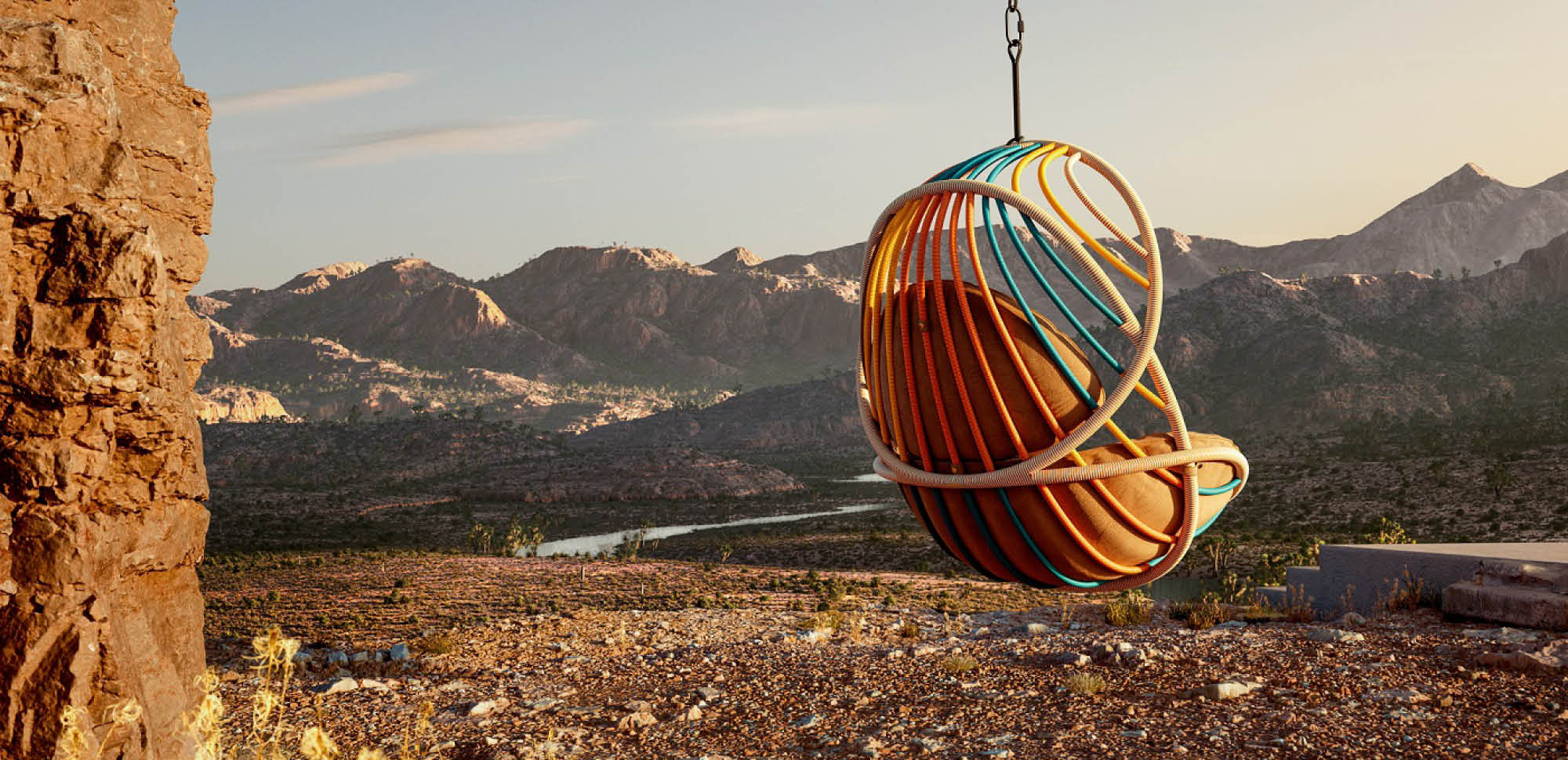 The hanging chair is the first collection to be wrapped rather than woven in 834 meters of DEDON Fiber Touch, and features a cradle-like organic form that's open, airy, light and inviting. Once inside, users can luxuriate in a comfy cushion, and feel, in Burks' own words, “as free as the breeze” when swinging.