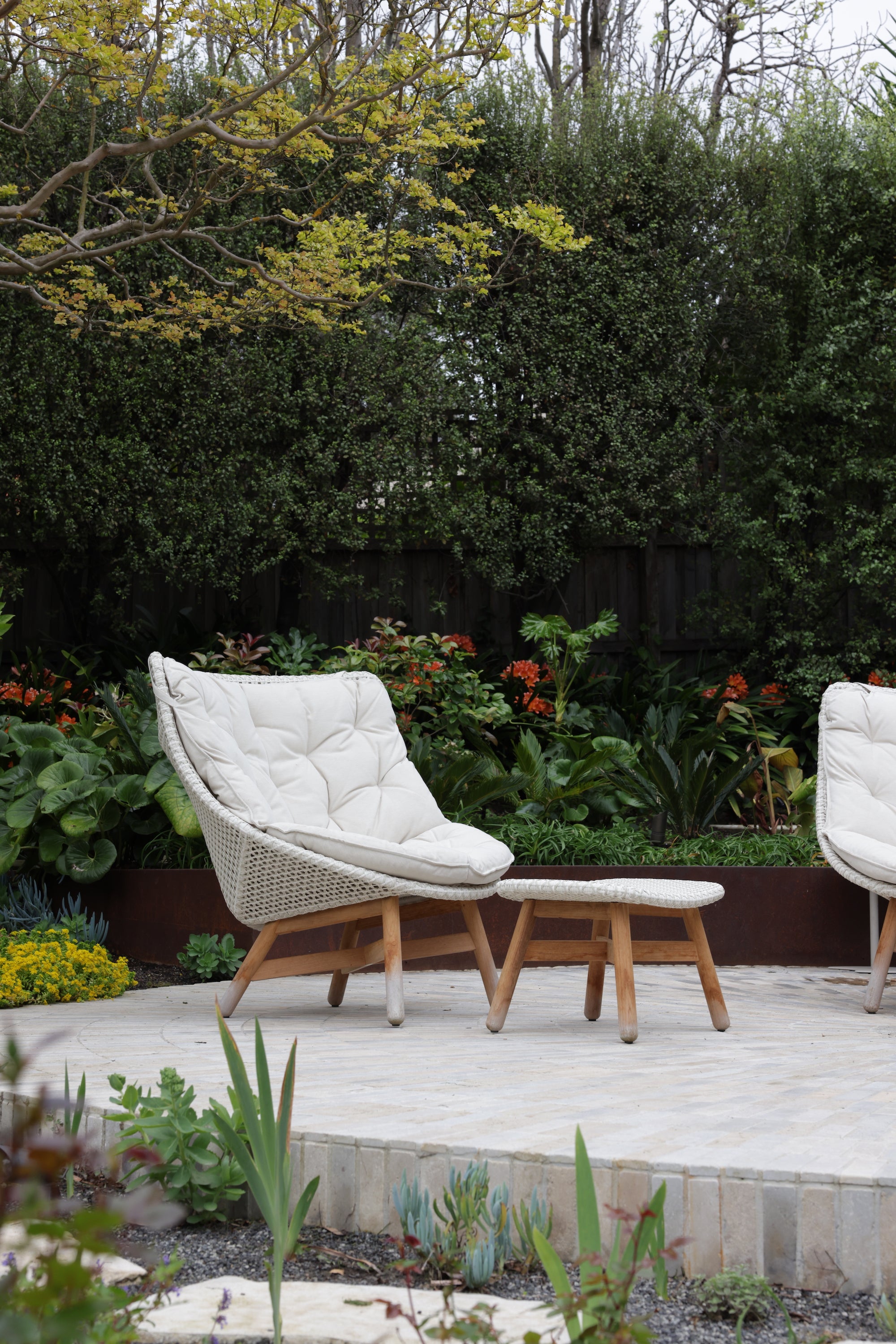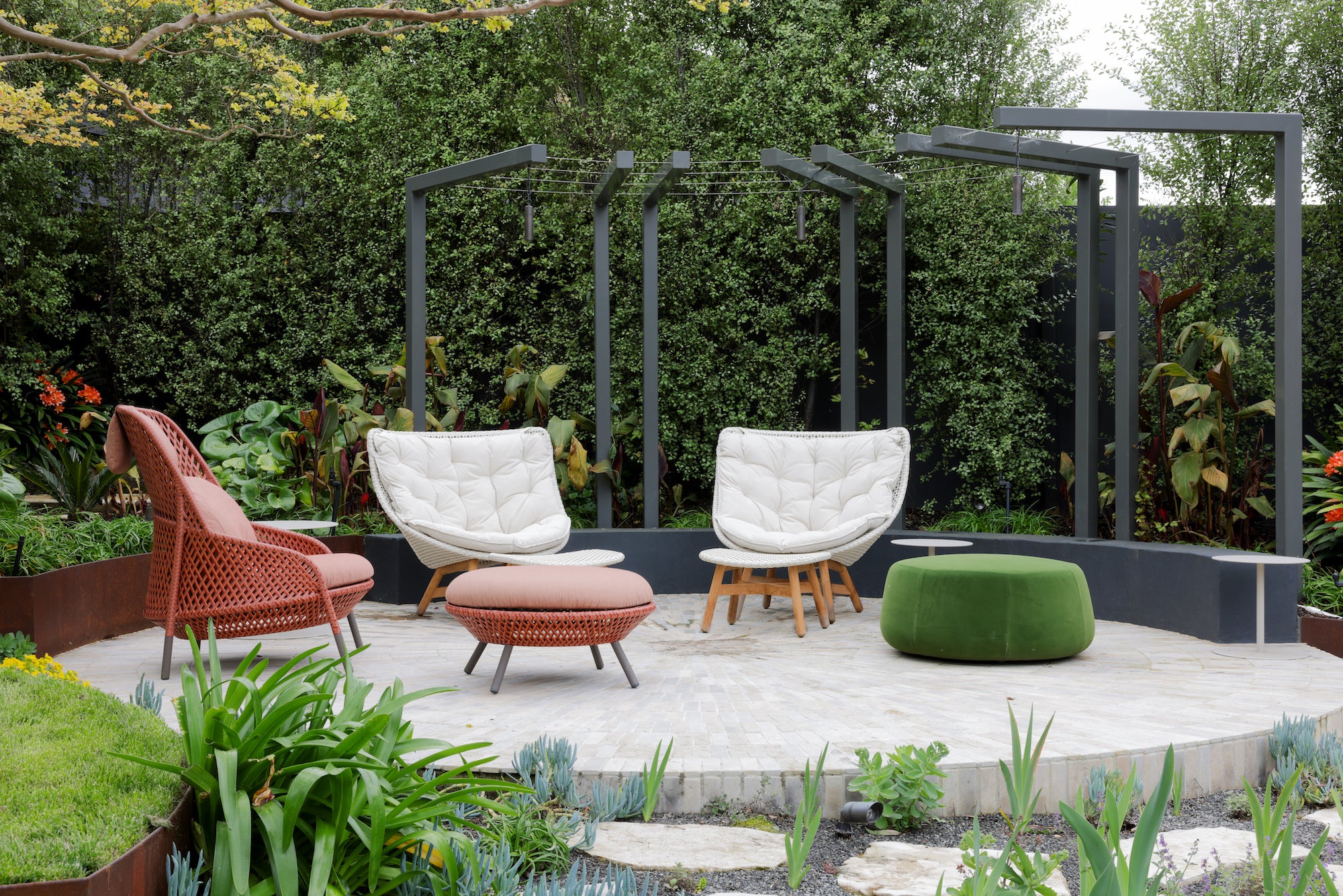 Complementing these features are outdoor furniture pieces, including DEDON's MBRACE and AHNDA lounge chairs and footstools, as well as Tribù's Drops side table and Nomad ottoman. The AHNDA Footstool here also doubles as a coffee table when removing upholstered top. Together these pieces provide comfort, style, and durability, making the garden perfect for relaxation and entertaining.