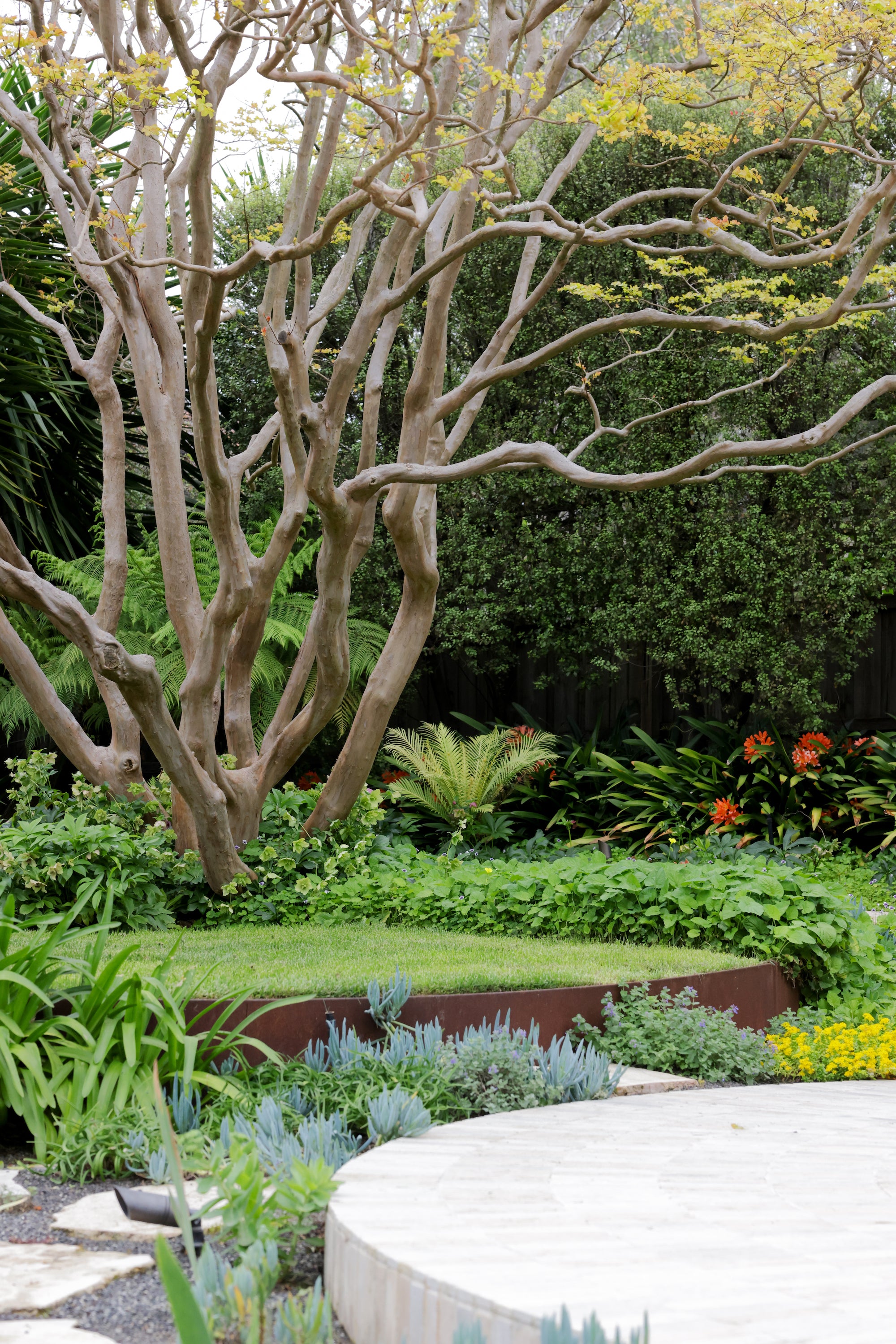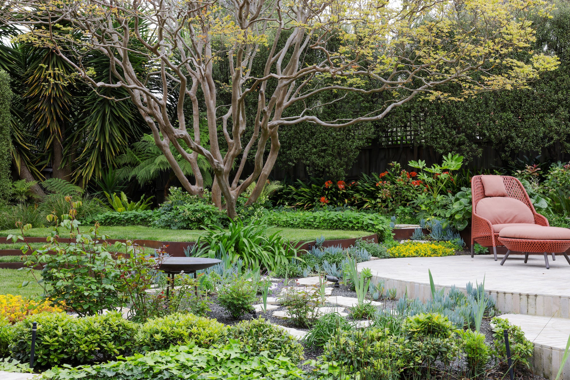 The Glen Iris garden is defined by standout elements that enhance its beauty and functionality. At its core is the majestic crepe myrtle tree, anchoring the space with elegance and timeless charm. The meticulously laid radial paving, crafted from limestone batten pavers by Eco Outdoor, adds drama while maintaining a soft, harmonious aesthetic.