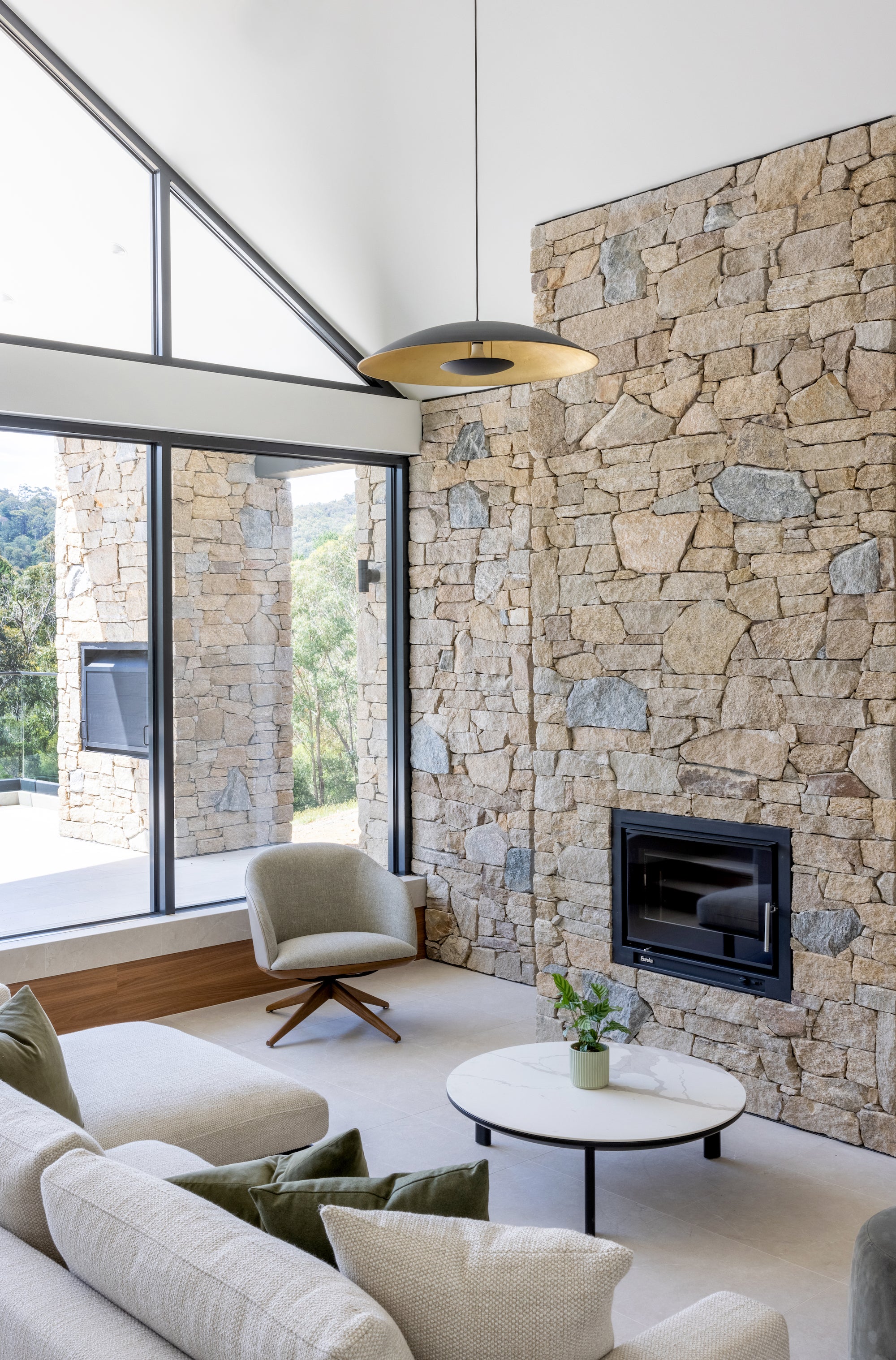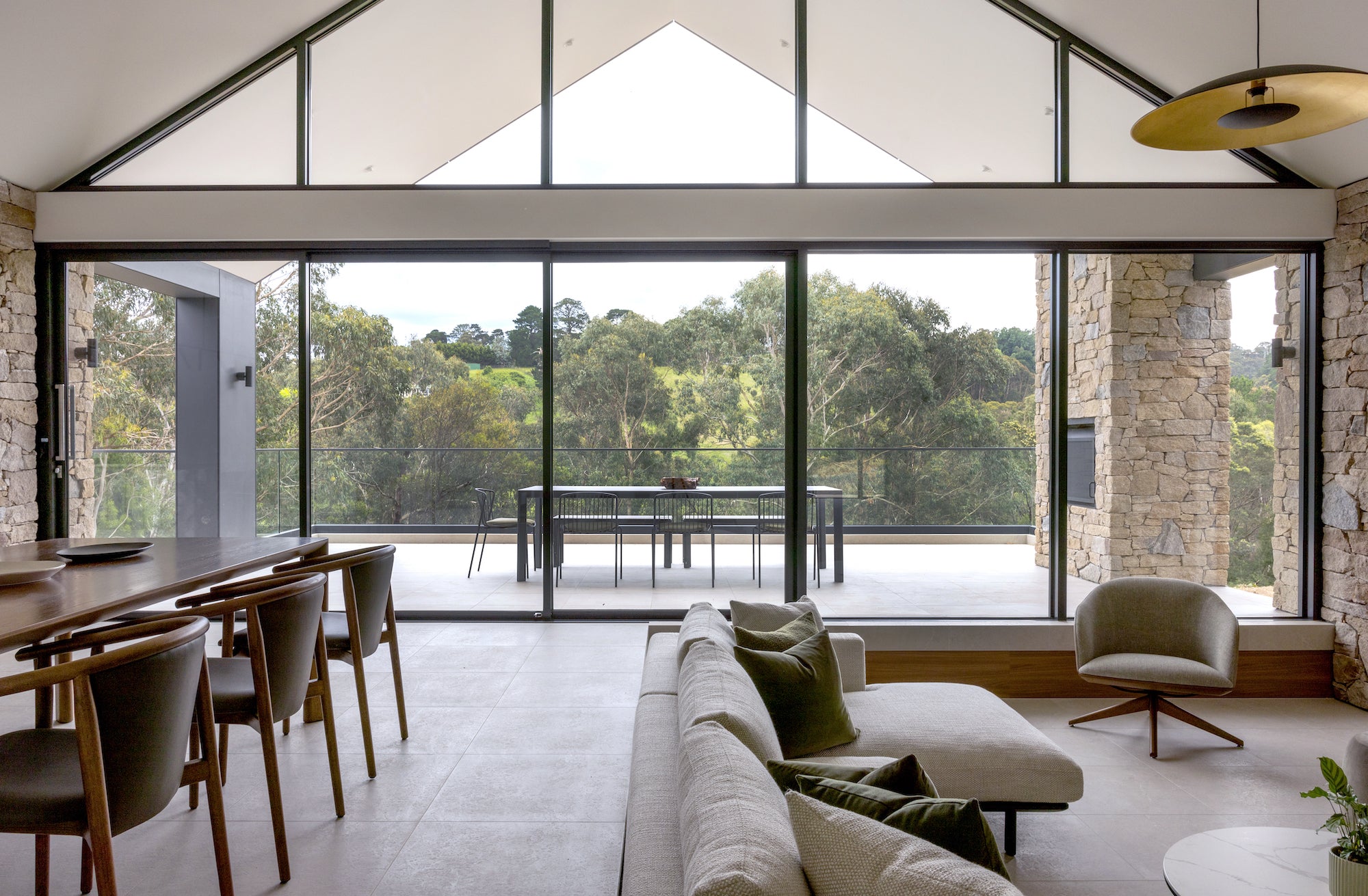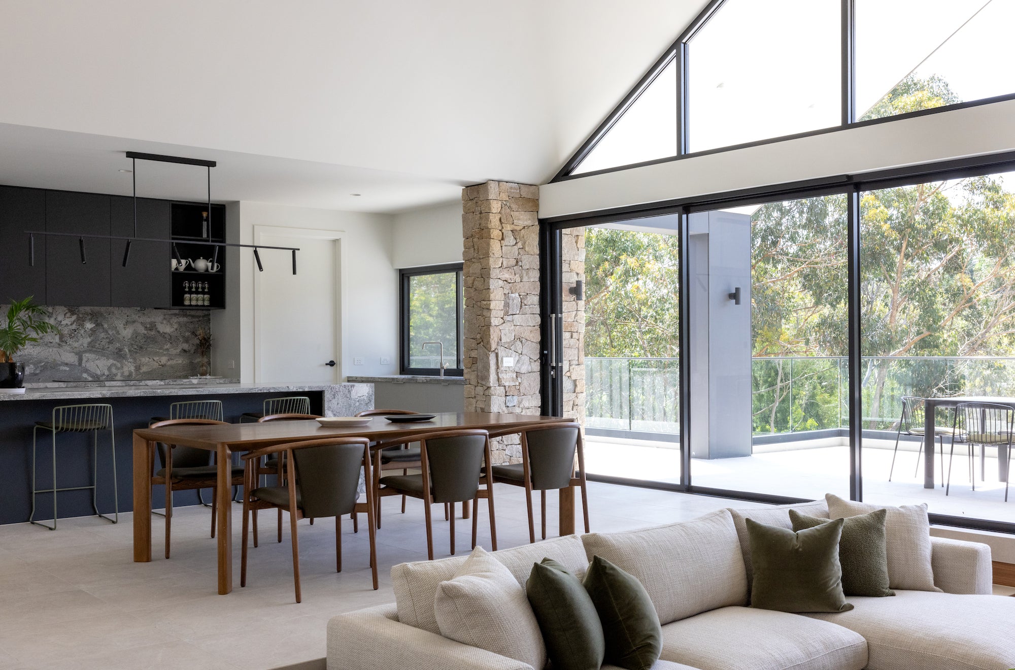 Whisker Architecture aimed to create a home that harmonised with its surroundings and reflected the values of sustainability, comfort, and elegance. Cosh Living’s curated selection of Australian-made furniture from Kett complements this vision, bringing a refined sense of warmth and connection to nature. The Glenaire Swivel and Otway modular sofa provide inviting seating in the open-plan living area, offering comfort while framing stunning views of the bushland. The Otway dining table and Otway armchairs further enhance the interior, echoing the home’s natural textures of stone, & timber, creating a visually cohesive atmosphere.