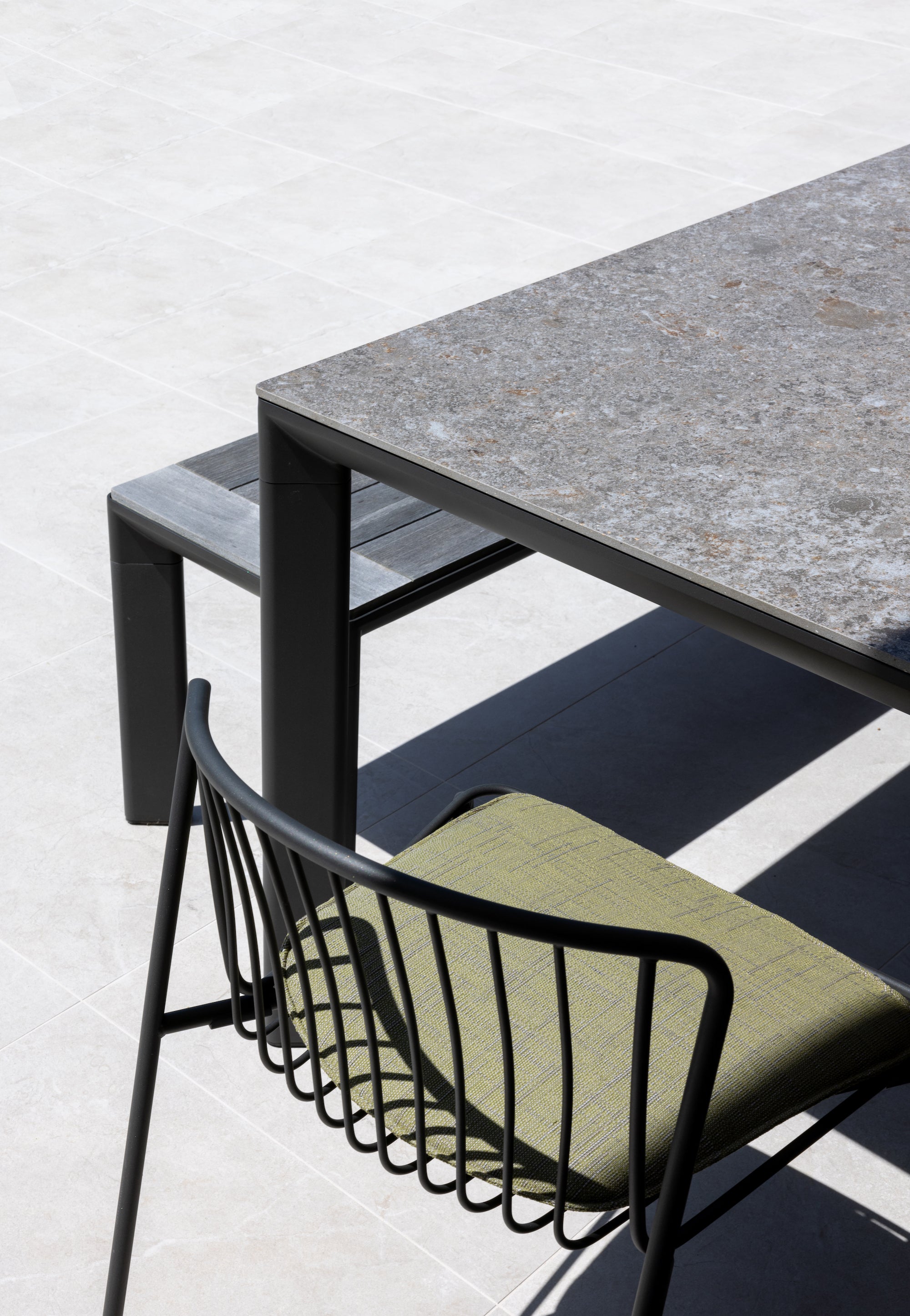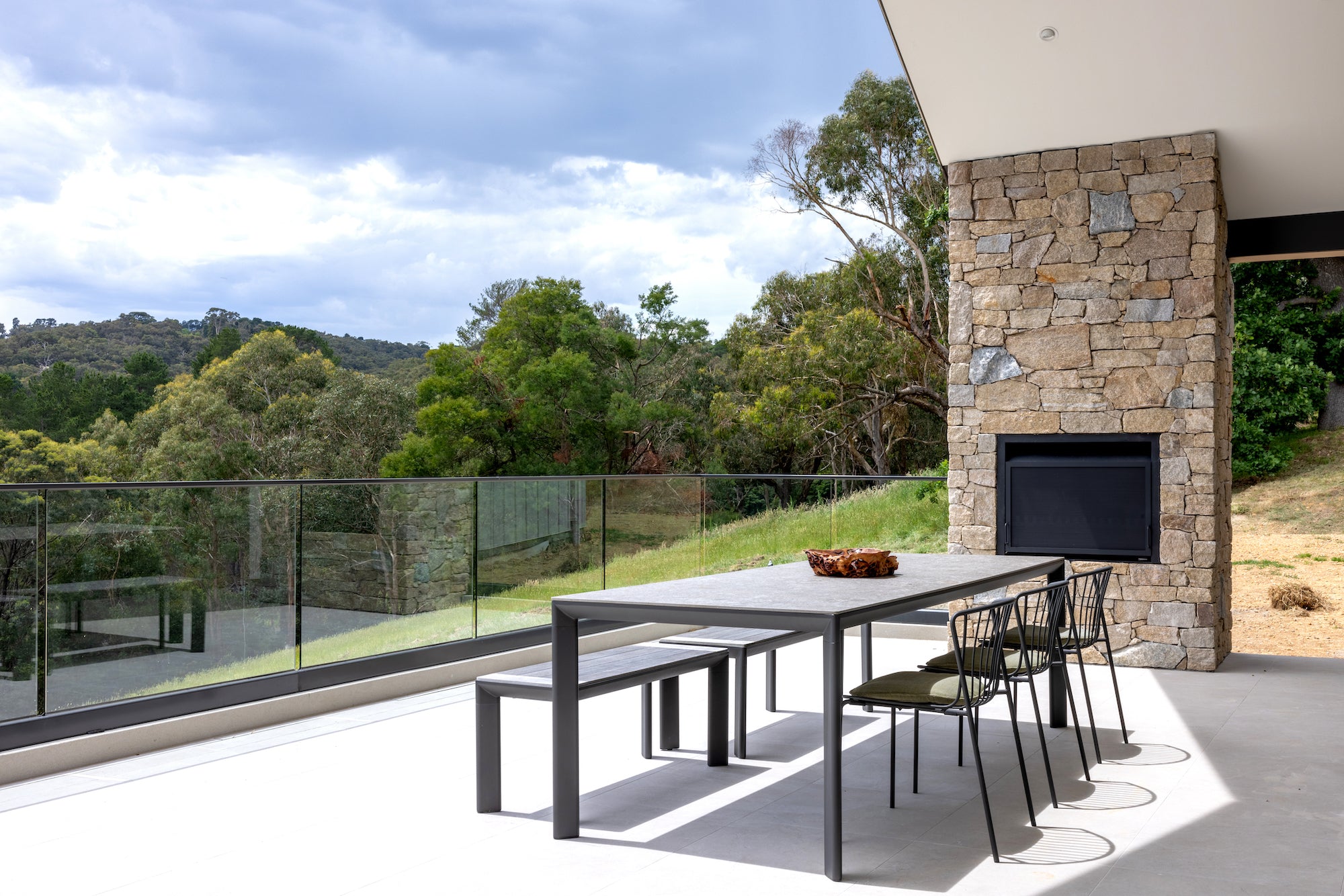 Outside, the Addis ceramic table , Wye chairs and Addis aluminium bench seats are perfect for the family to enjoy, creating an ideal setting for alfresco dining, making the most of the northern light and views across the valley.