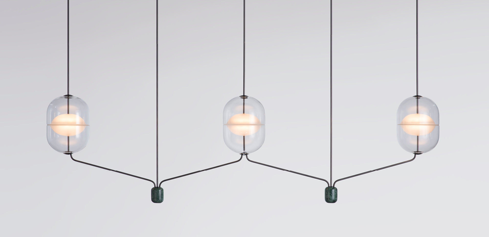 Indre elegantly conjures the suspended catenary streetlights and cobbled stone streets of Copenhagen. Delicately rendered double-wall glass capsules cradle the soft glow of floating internal lights, each connected by graceful interlinking rods and anchored with rich stone or timber detailing.