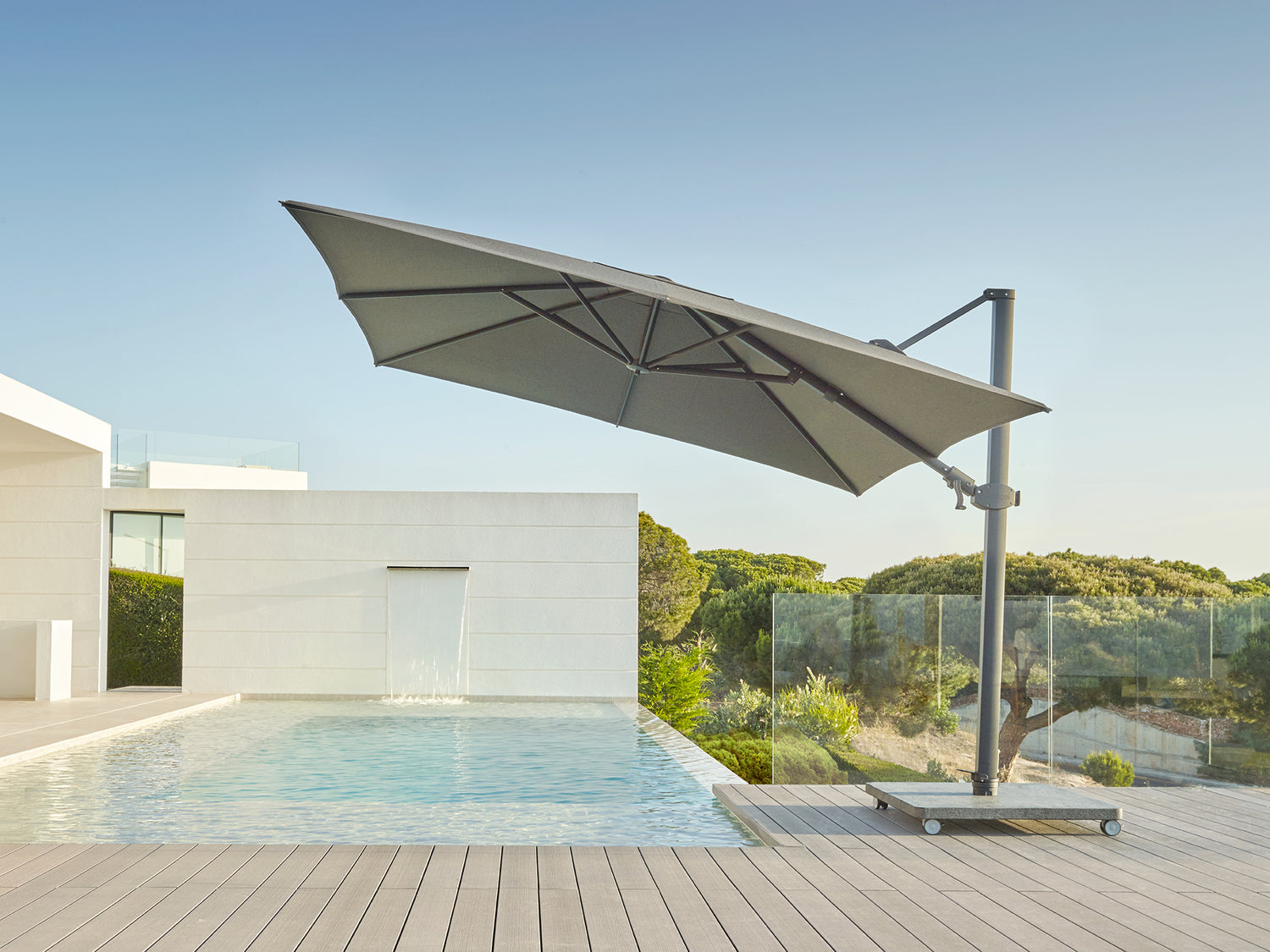 A style statement: shade as a feast for the eyes! Fifteen years of know-how in the development of quality and modern shade making is exposed in the Caractere collection. Class and style in every detail. The side pole umbrellas can rotate 360, tilt in height, tilt left/right. All canopies have a gradient of 10 which is exceptionally taut and flat.