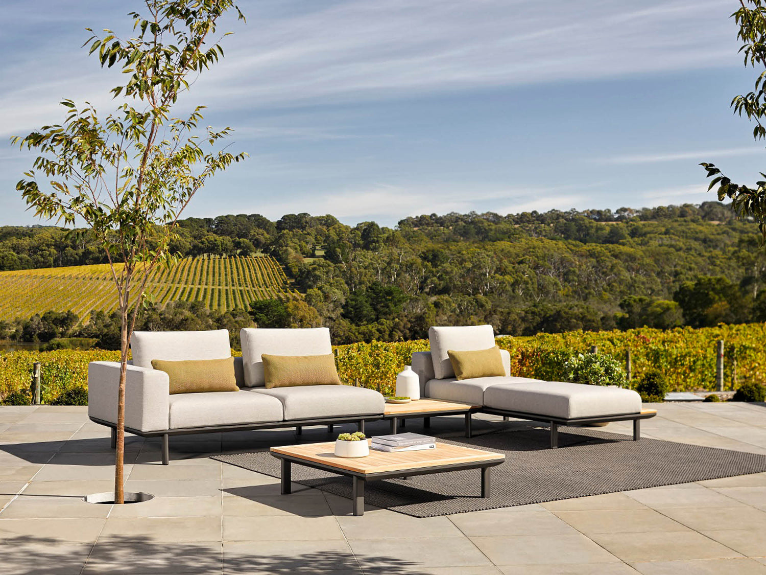 The Addis is a durable outdoor sofa. The frames are crafted from powder-coated aluminium, with cushions upholstered locally in a fabric of your choice. There are many different set sized or modular configurations available, and matching teak or ceramic coffee tables to complete the setting.