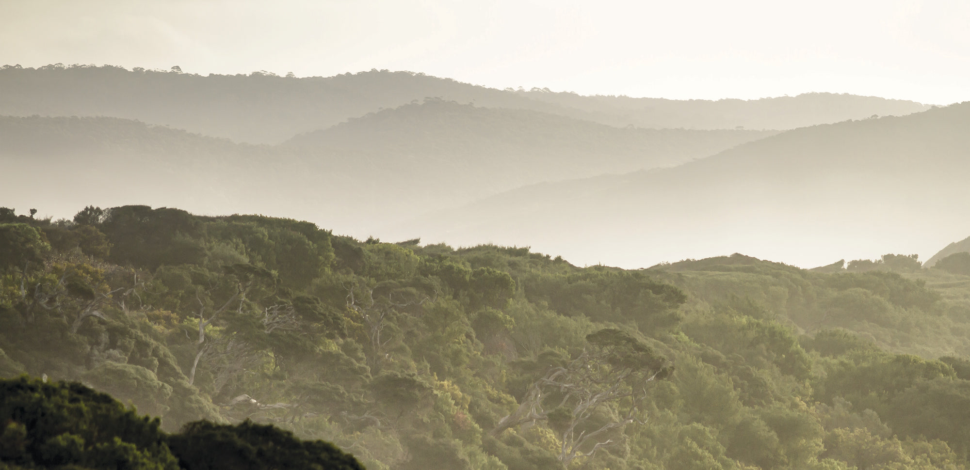"Towering Mountain Ash, settled fern gullies and dappled light through a forest canopy."