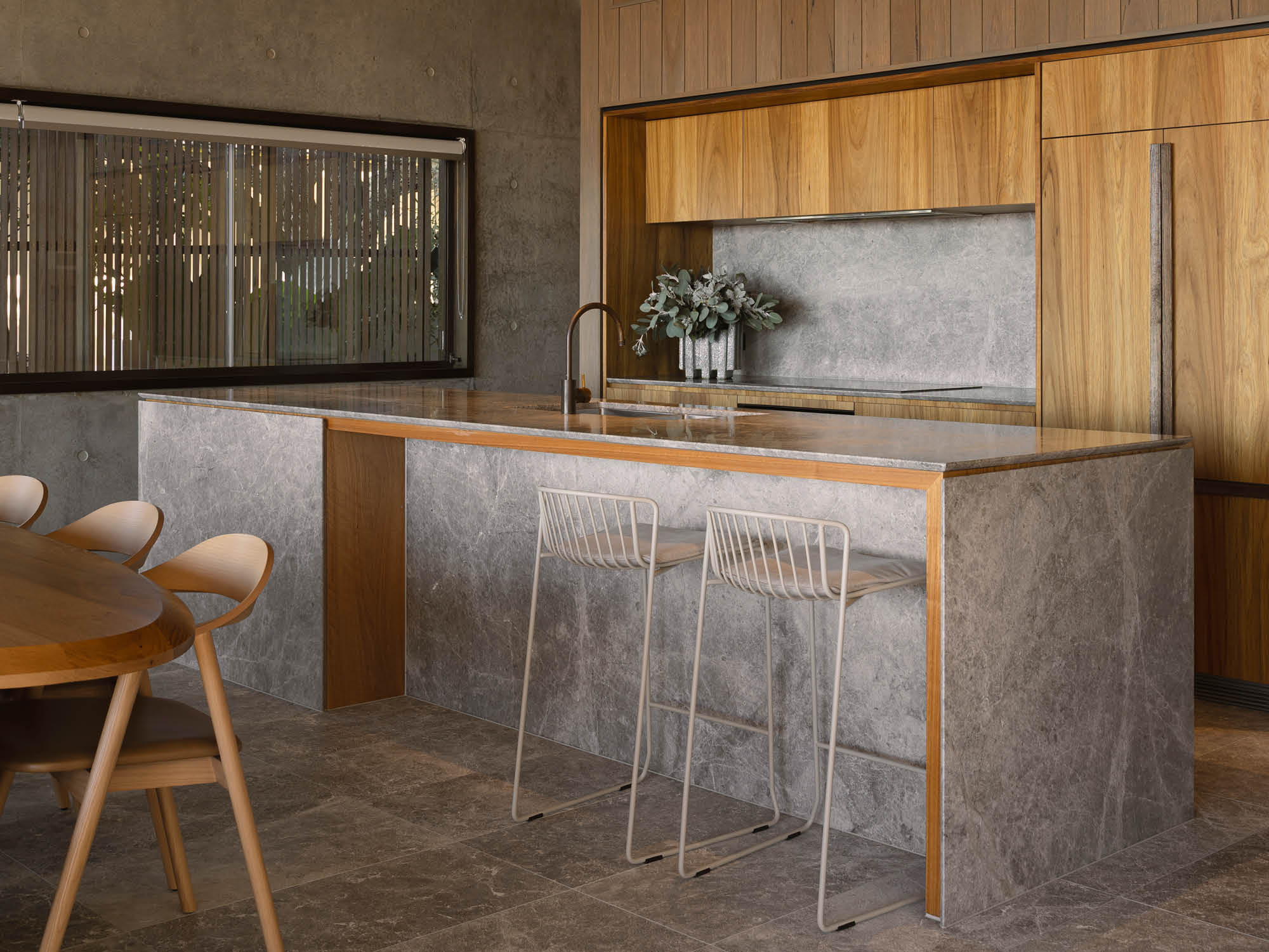 Every space in Kugeki House feels considered. Furniture chosen echo's the architecture’s balance of strength and softness. In the dining room, sculptural timber seating softens the stone and concrete palette, while at the kitchen island, slimline Wye barstools bring a sense of lightness against the weight of the bench.