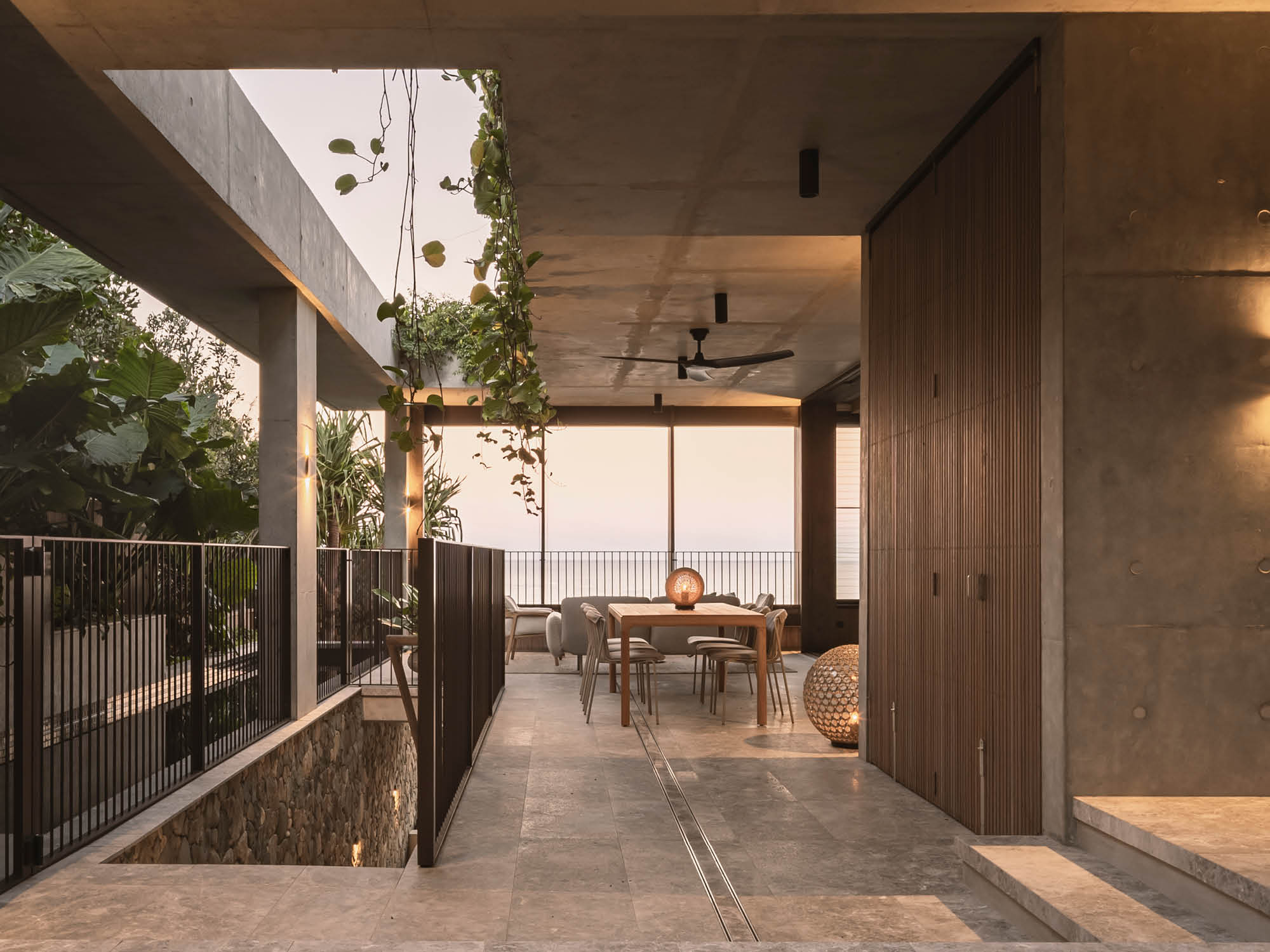 Concrete, timber, and glass define the building’s structure, grounding the home in its landscape while inviting light and breezes throughout. Overhangs and courtyards add depth and rhythm to the home’s strong architectural lines, while deep verandahs and sliding doors blur the threshold between indoors and outdoors.