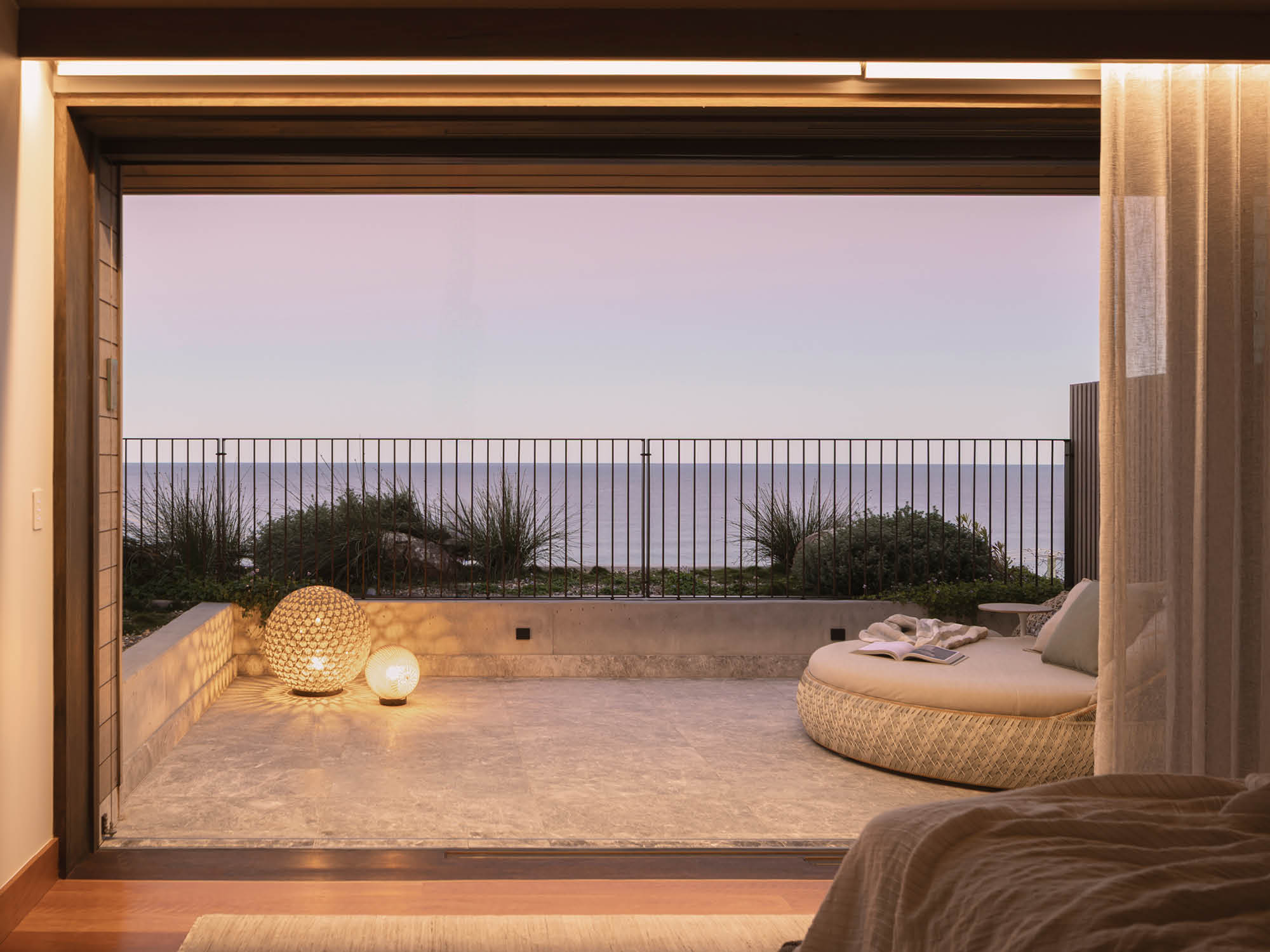 The bedroom continues this dialogue, anchored by the generous upholstered Erskine bed, whose gentle curves echo the home’s organic gestures. As day turns to evening, handwoven Monsieur Tricot lighting casts a soft interplay of shadows across the private terrace. The Dala daybed invites quiet relaxation, enriching the home’s layered textures and extending its atmosphere well into the night.
