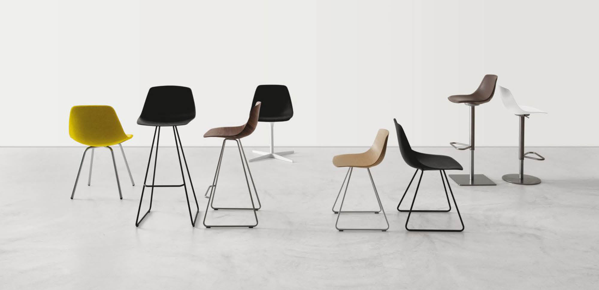 An inviting egg-shaped shell in wood, with various frame options and different heights for dining or stools. This collection of chairs and stools can be suited to any style of table.