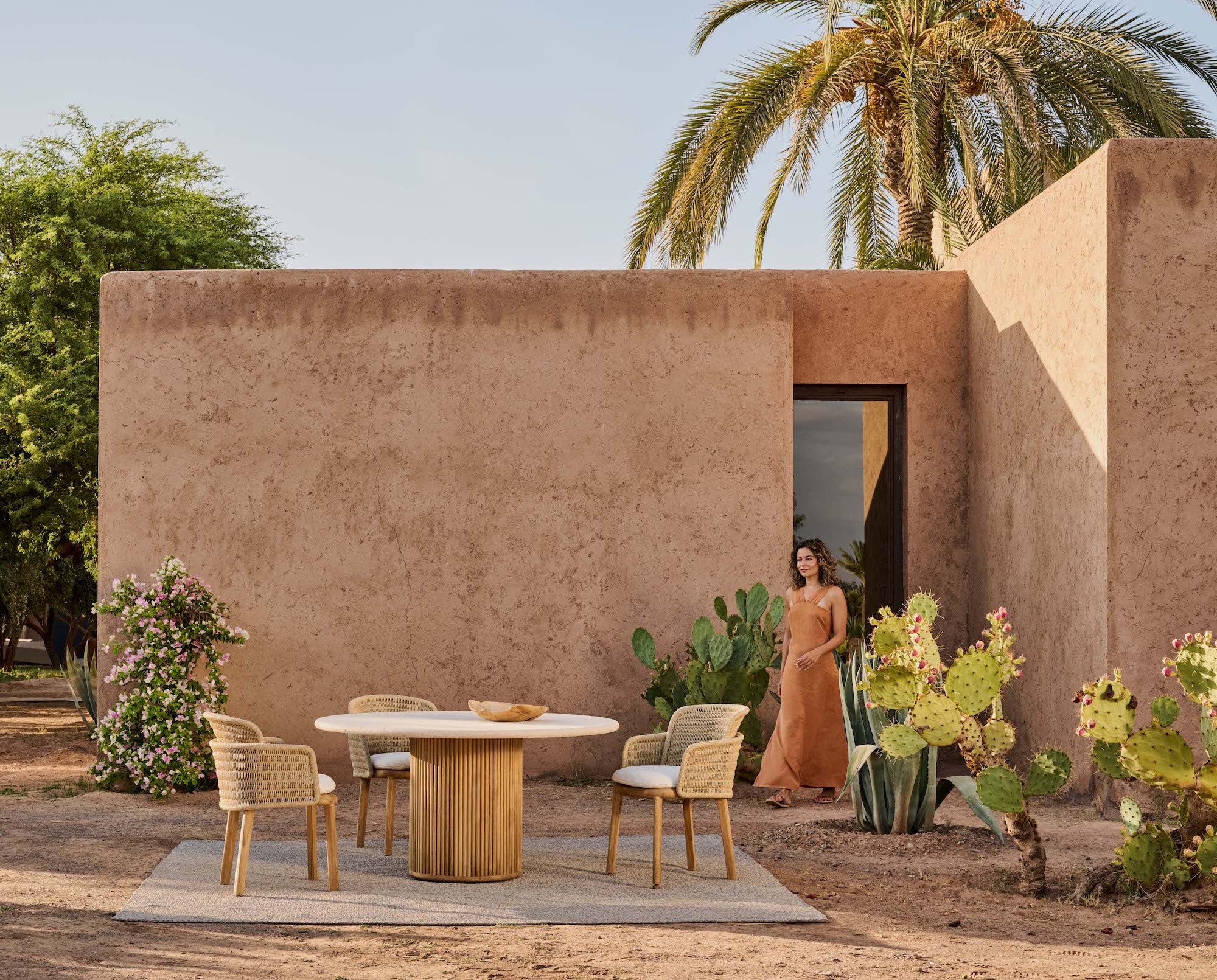 Otto was inspired by a rhythmic ‘ribbon’ pattern, often found in Italian bar counters from the ‘40s. Like an ancient architectural pillar, the robust yet elegant patterned base supports a floating round & rectangle tabletop. Available in ceramics and natural travertine, making its durable and timeless design versatile to many outdoor settings.
