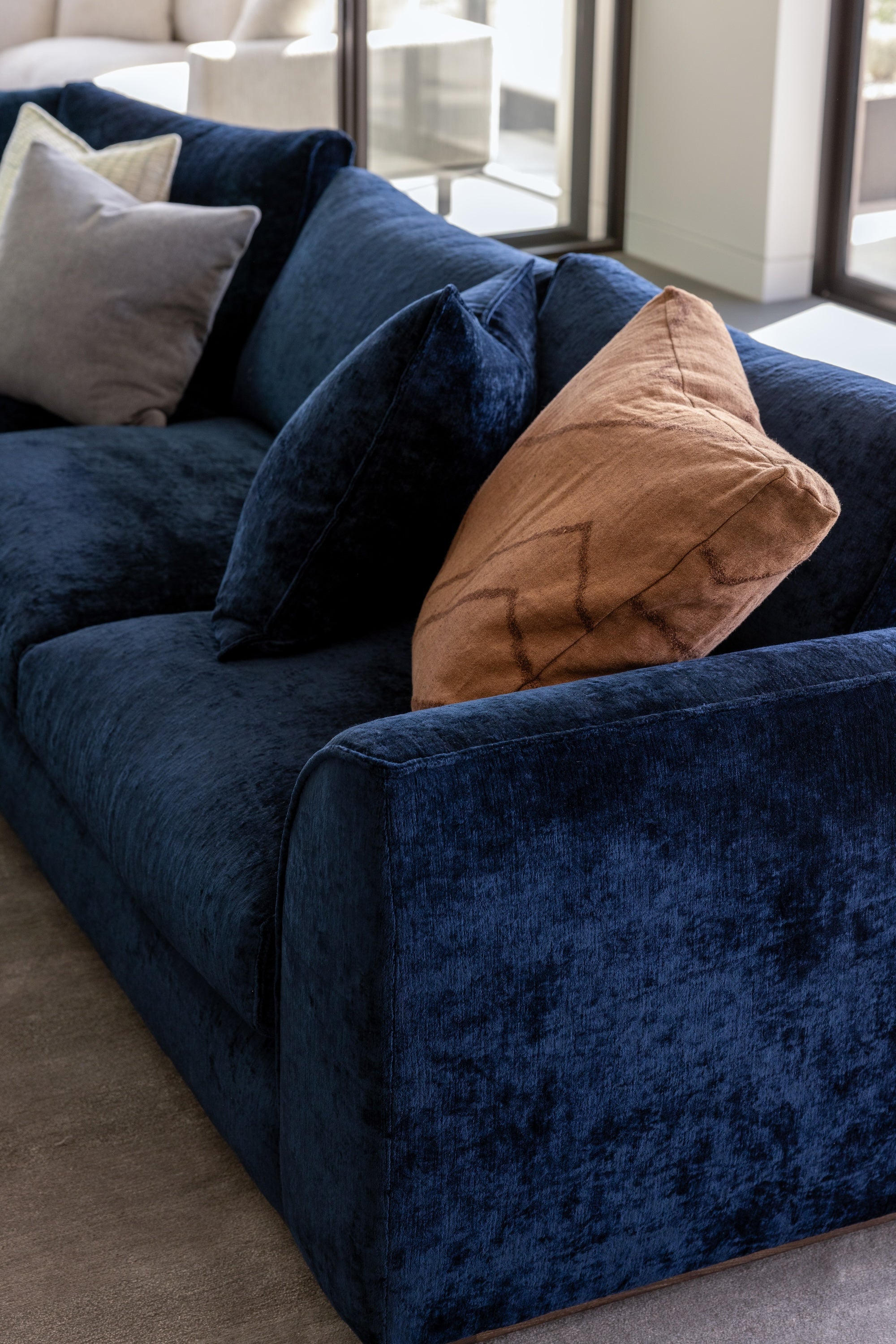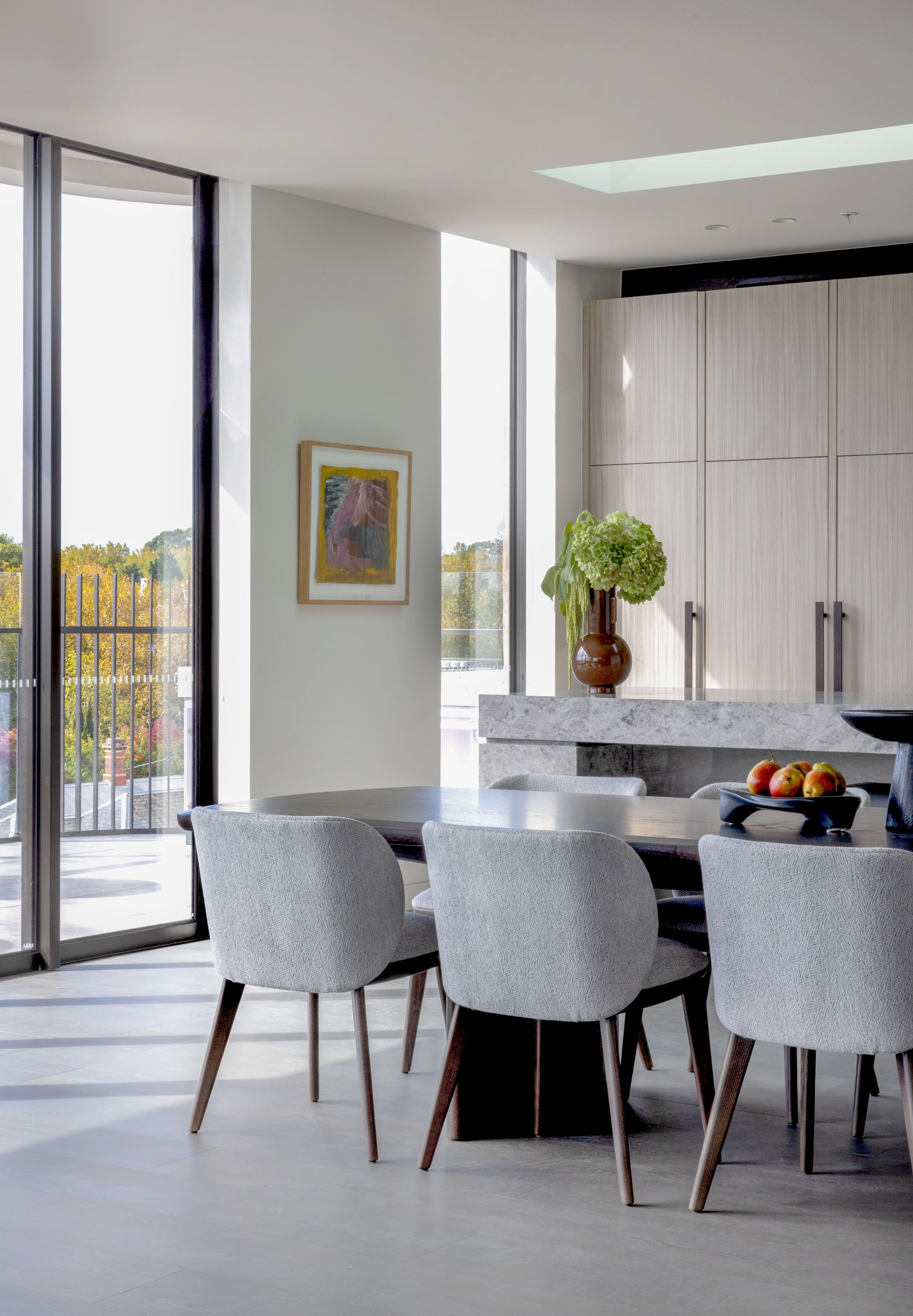 The interiors at The Carlile are guided by a deep appreciation for material richness and sculptural restraint. A navy velvet Kett modular sofa serves as the centrepiece in the living area, paired with a rust-toned Johanna ottoman and Portland coffee tables in a smoked oak timber stain. Rounded, organic forms such as the ivory Jade lounge chair from Potocco offer a soft contrast to the linearity of the architecture. The palette combines tonal depth with carefully considered pops of colour, creating a sense of warmth, sophistication, and visual interest. Natural light, clean lines, and thoughtful detailing throughout the home contribute to a calming yet expressive atmosphere.