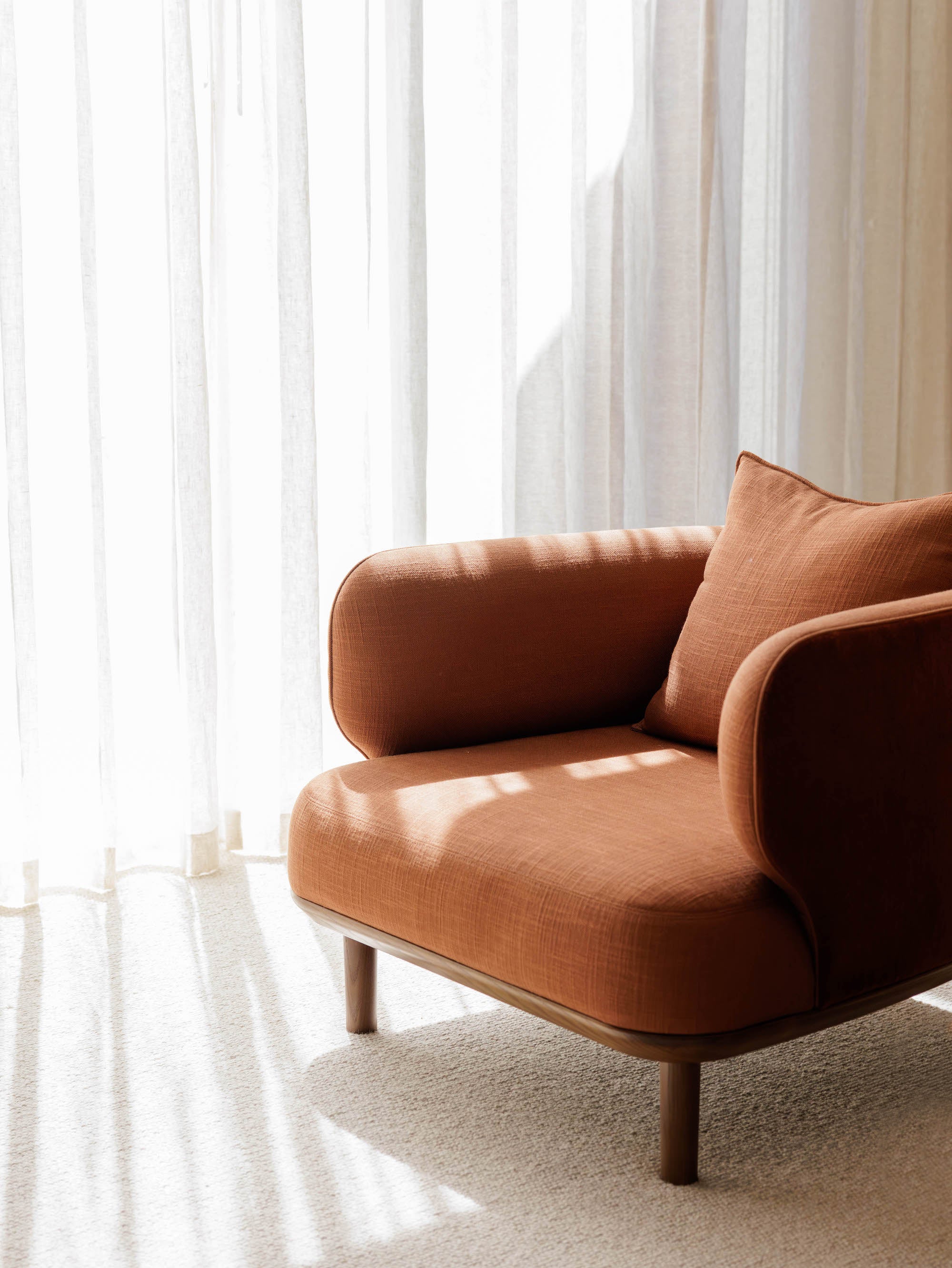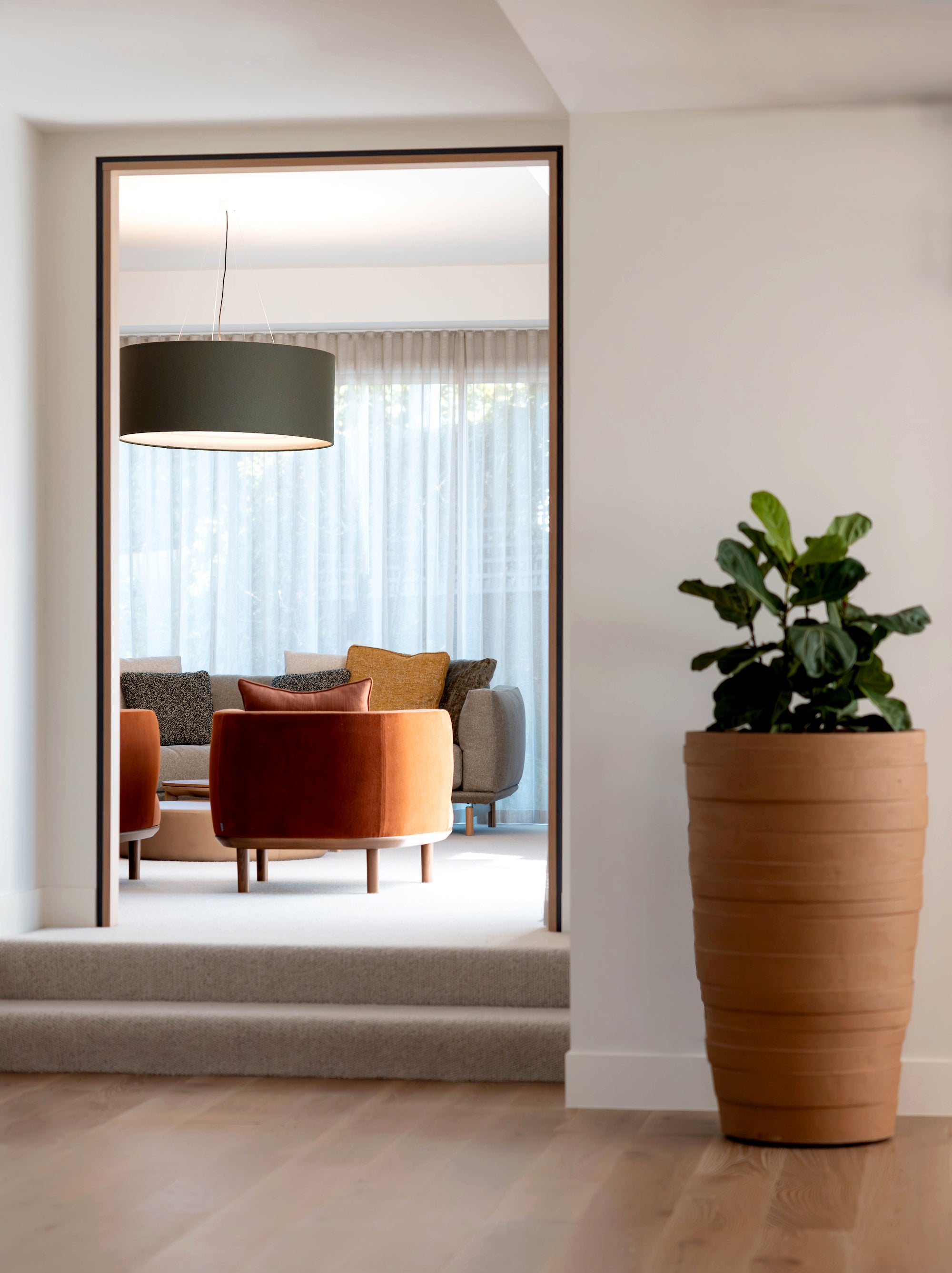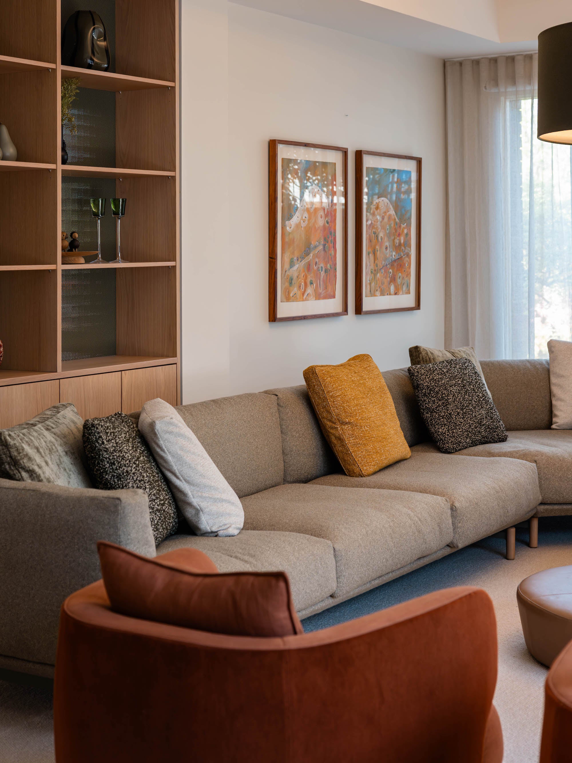 The Johanna Occasional Chairs continue Kett’s story of sculptural comfort in the Second living area. With their enveloping curves and tailored upholstery, they invite a moment of rest and reflection. In the second living area, this sense of quiet sophistication unfolds through the pairing of the Featherop Sofa The Frame Living System grounds the space with thoughtful structure, offering a refined balance between softness and architectural form. the room offers a place ro the extended family visits