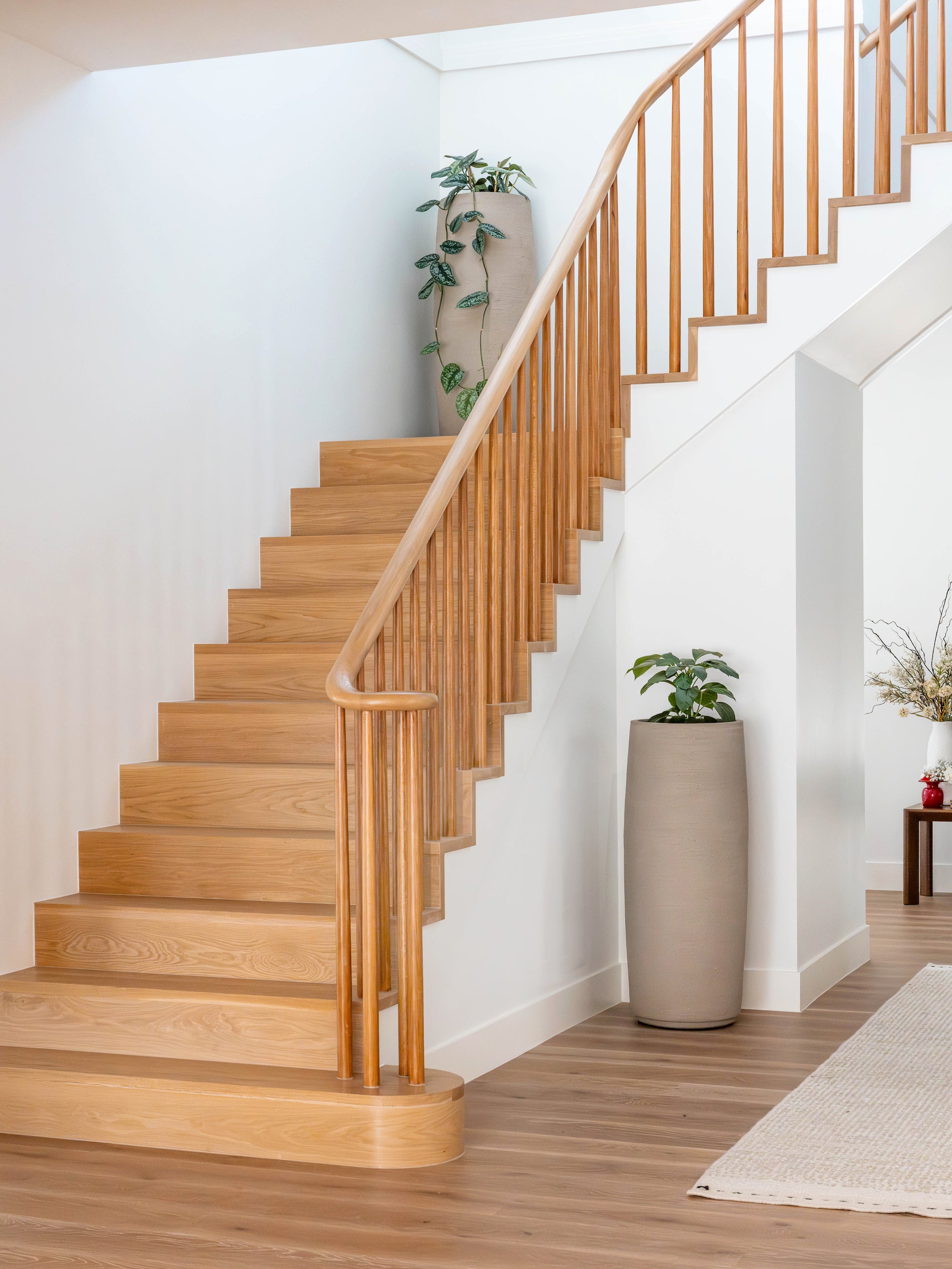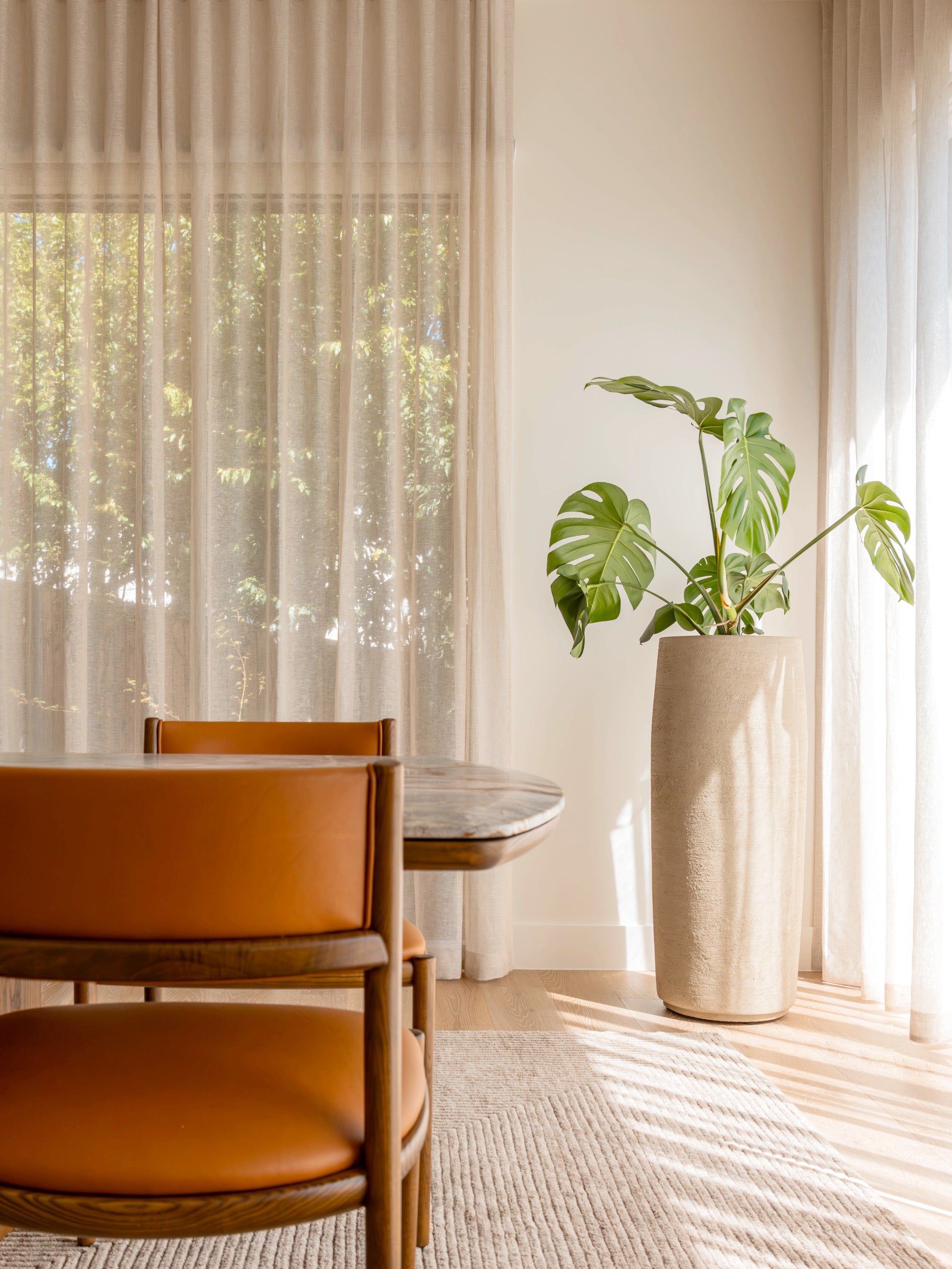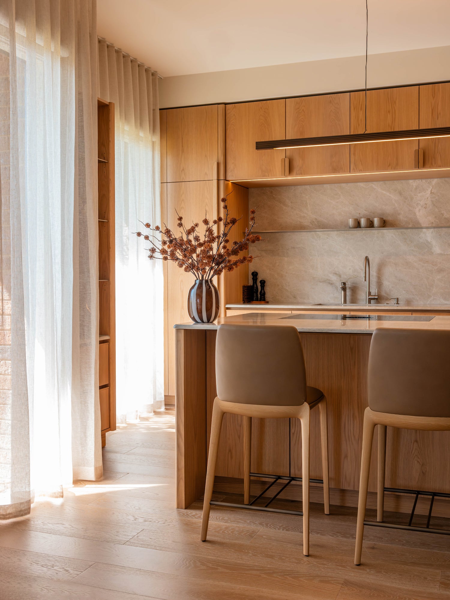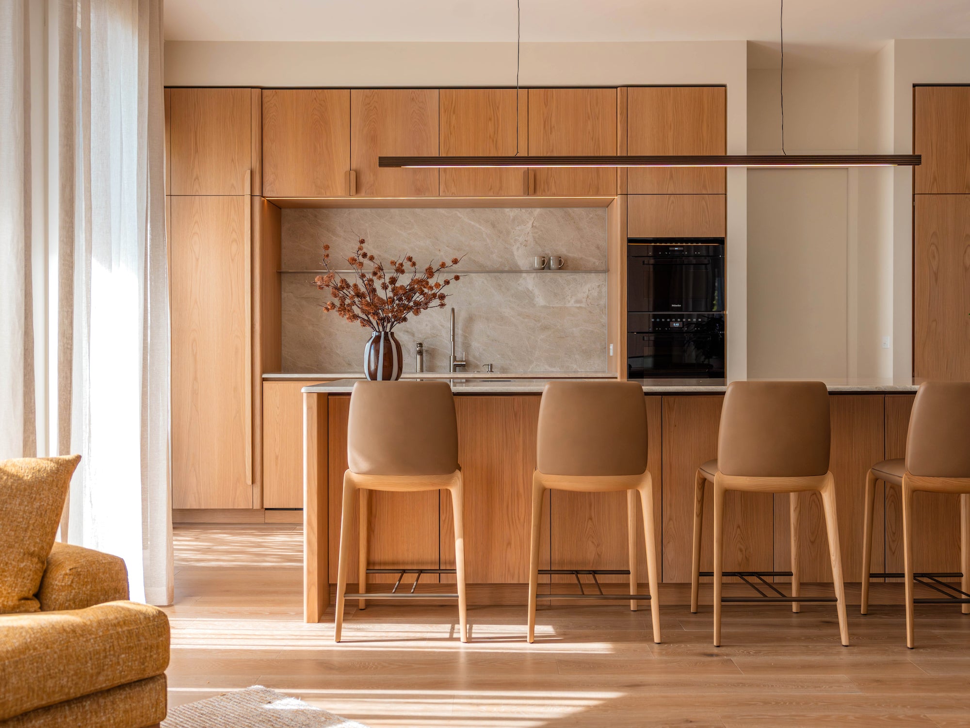 The kitchen is where soft-toned joinery and natural finishes set the tone for the entire home. Along the island, Hiru Barstools by Potocco provide a sculptural counterpoint. Their curved timber frames and fine detailing speak to Italian craftsmanship while complementing the warmth and texture of the Australian-made joinery. finsihed in a naural timber and tan lather they add to the the bight natural and warm aestheric