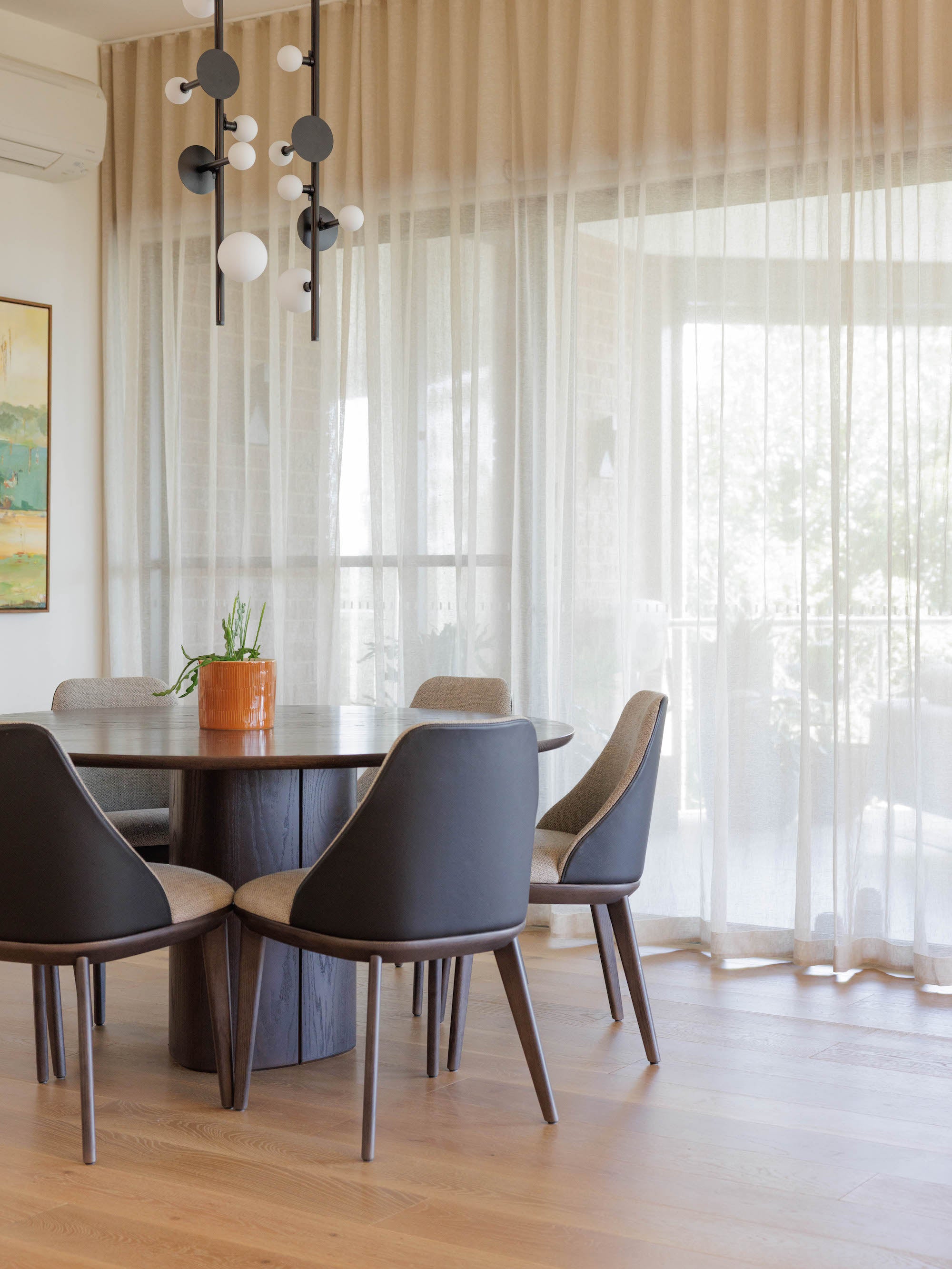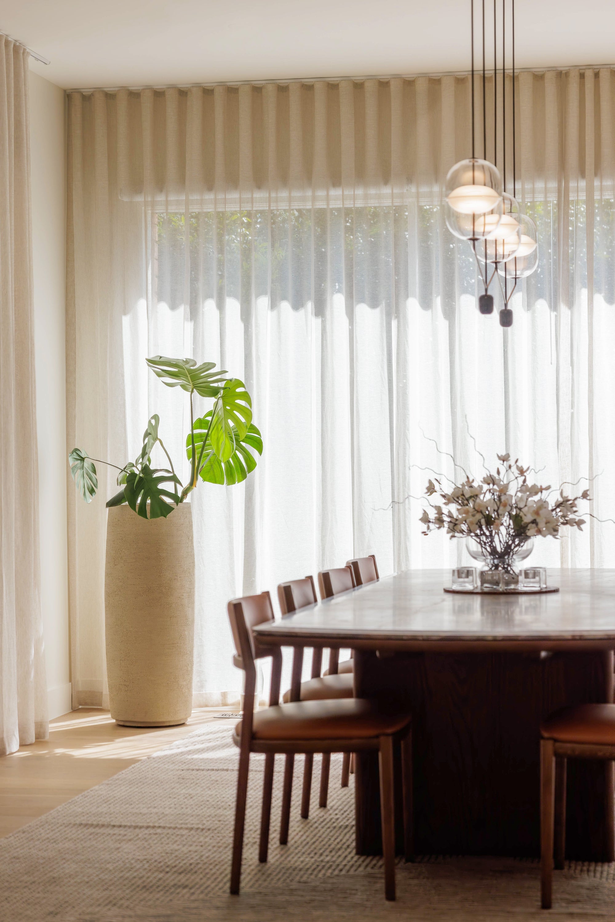 The Portland Pedestal Dining Table by Kett takes centre stage in the dining space, offering an elegant foundation for family gatherings. Its solid timber base and rounded top encourage connection and conversation, while the Portland Side Chairs complete the setting with understated comfort. The combination of natural timber and refined detailing ties seamlessly with the joinery that surrounds it.