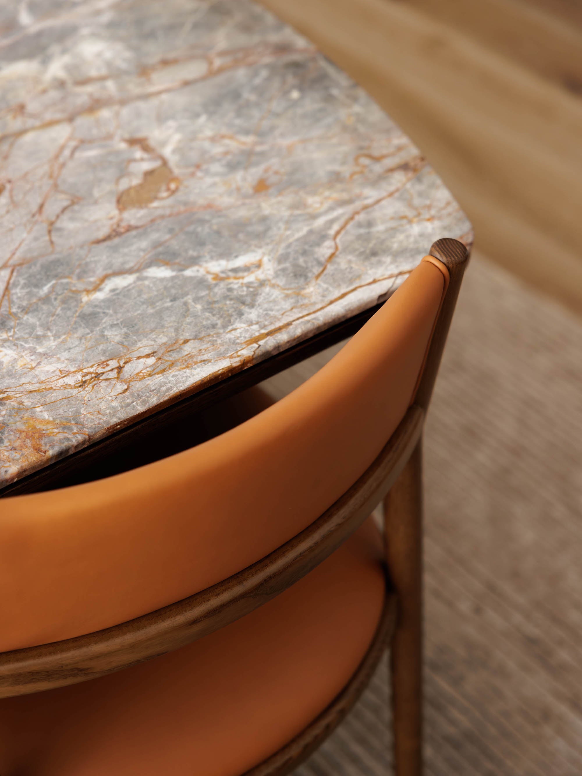 From here, the space opens into a larger formal dining area anchored by the Portland Pedestal Dining Table, custom-made with a marble top that introduces a quiet sense of luxury. Surrounding it, Portland Side Chairs in burnt orange leather bring depth and warmth to the setting, their sculpted form echoing the organic flow of the interior.
