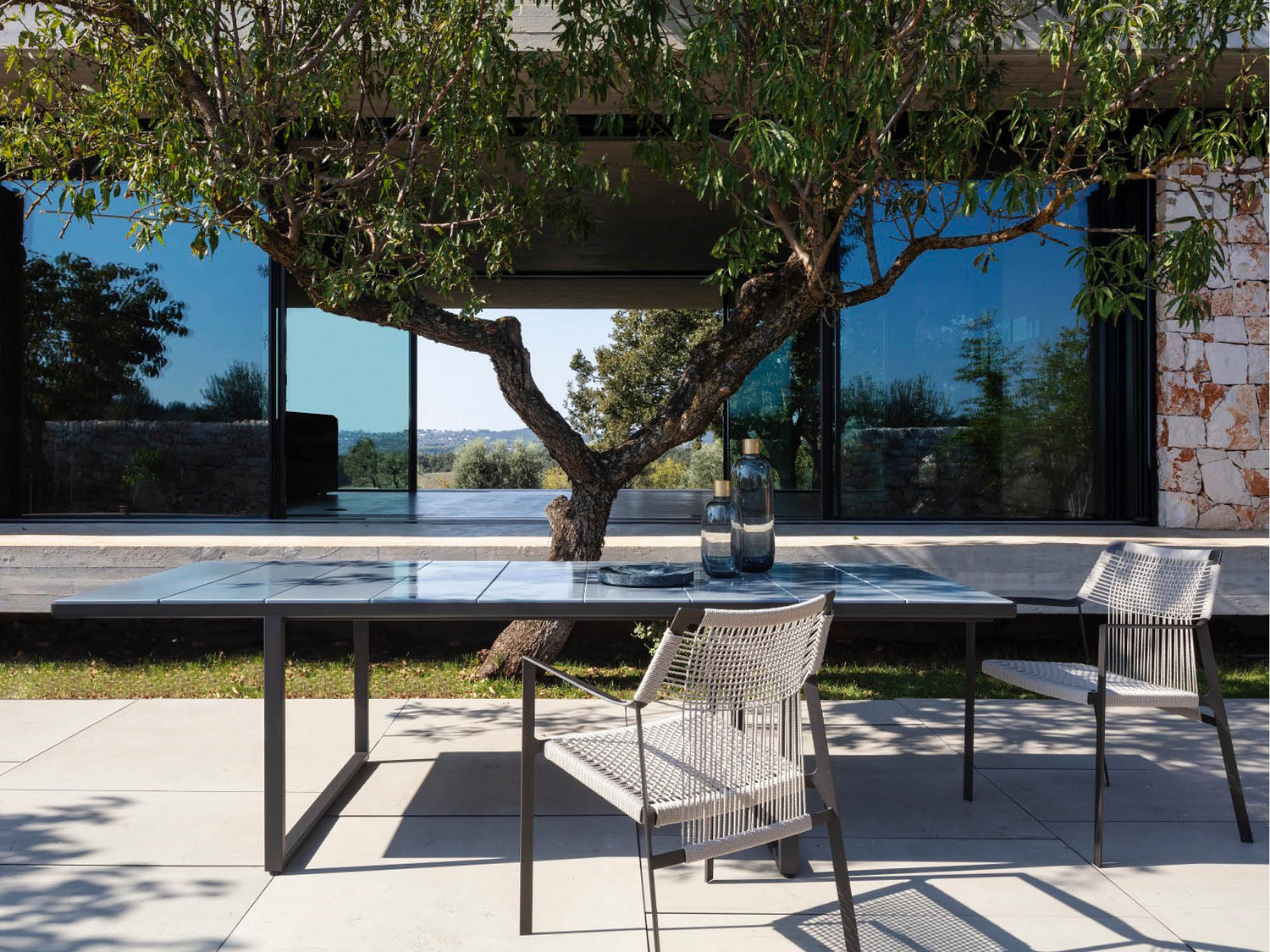 The NODI chair’s form and silhouette are characterised by twisted-interlaced rope stretched across a precise geometric frame. Refined proportions and a minimalist approach lend a casual, lightness to the collection. The slim profile of the arm is angled slightly inward in a welcoming gesture.