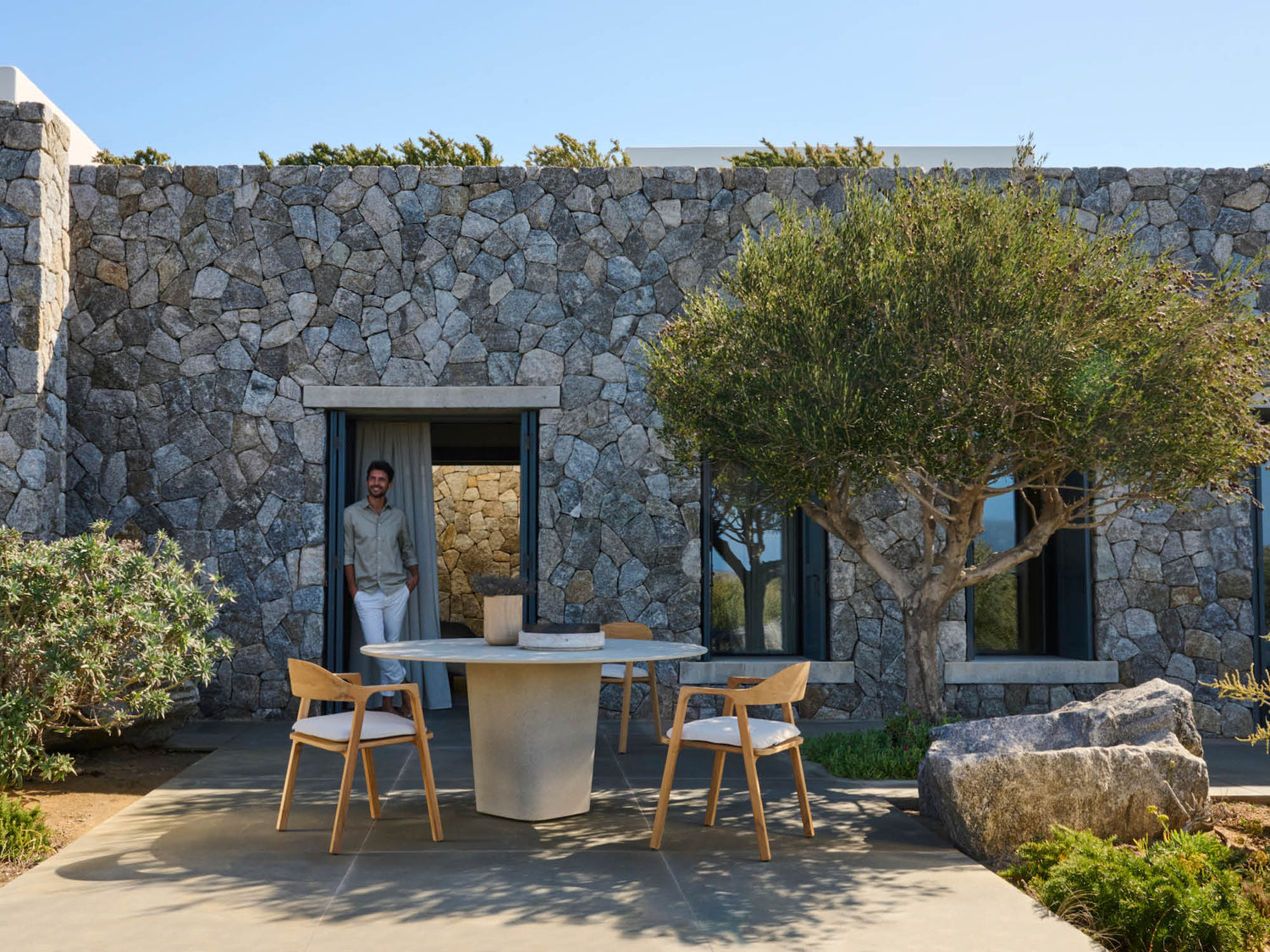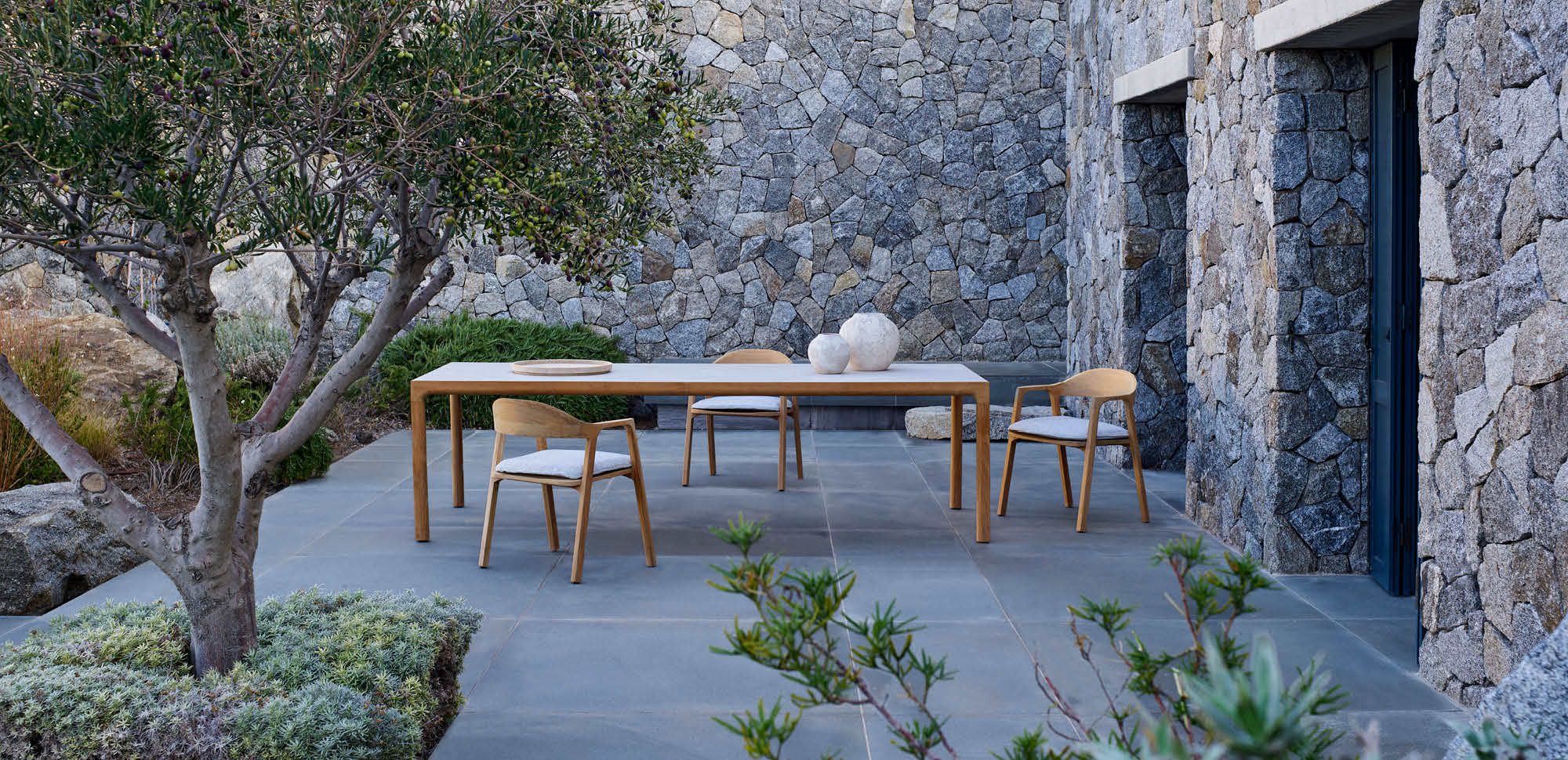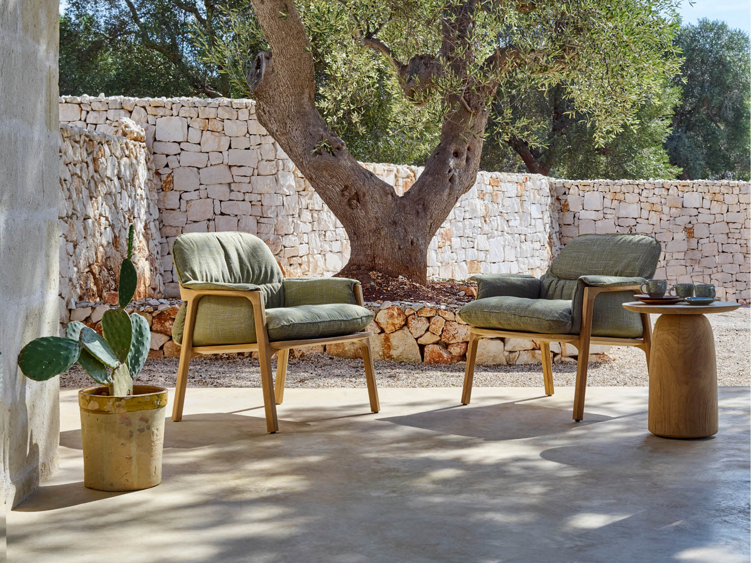 into the broad curve of the backrest. Designer Monica Armani used what she calls ‘noble teak wood’ for its warmth,