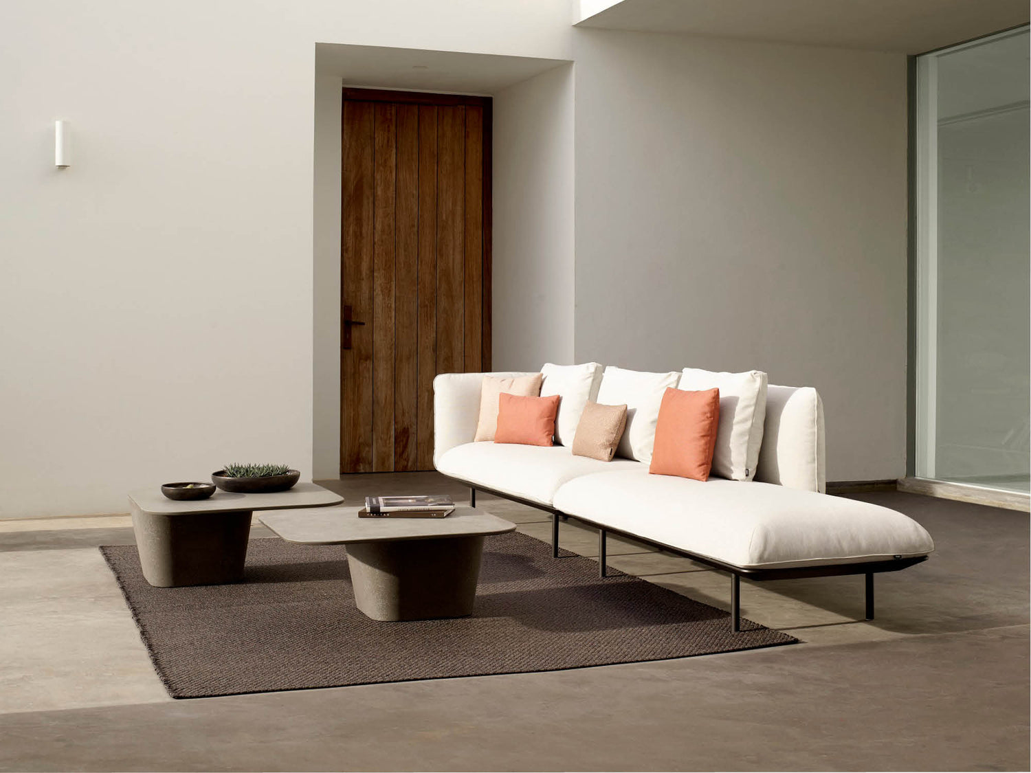 Curl up and relax on the modular Senja sofa. The highly flexible design invites you to combine a one, two or three seater module with either high or low arms. Integrated teak or glazed lava stone tables in linen or ocean can be inserted anywhere, keeping everything you need in easy reach. Slim console tables attached behind the sofa and neat side tables further personalise the look.