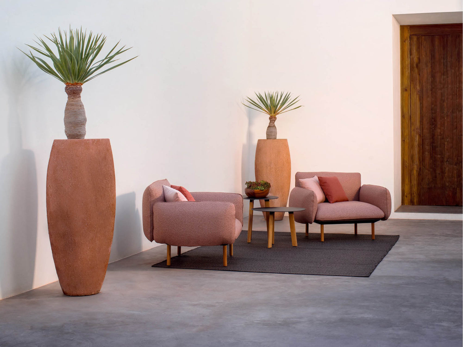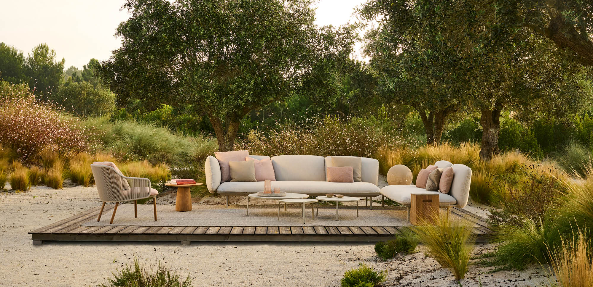 Senja comes with regular and extra-deep cushions. The generous filling gives them a pleasing, organic shape, finished with a piped seam. The powder-coated aluminium frame in linen or wengé is available with teak or matching aluminium legs.