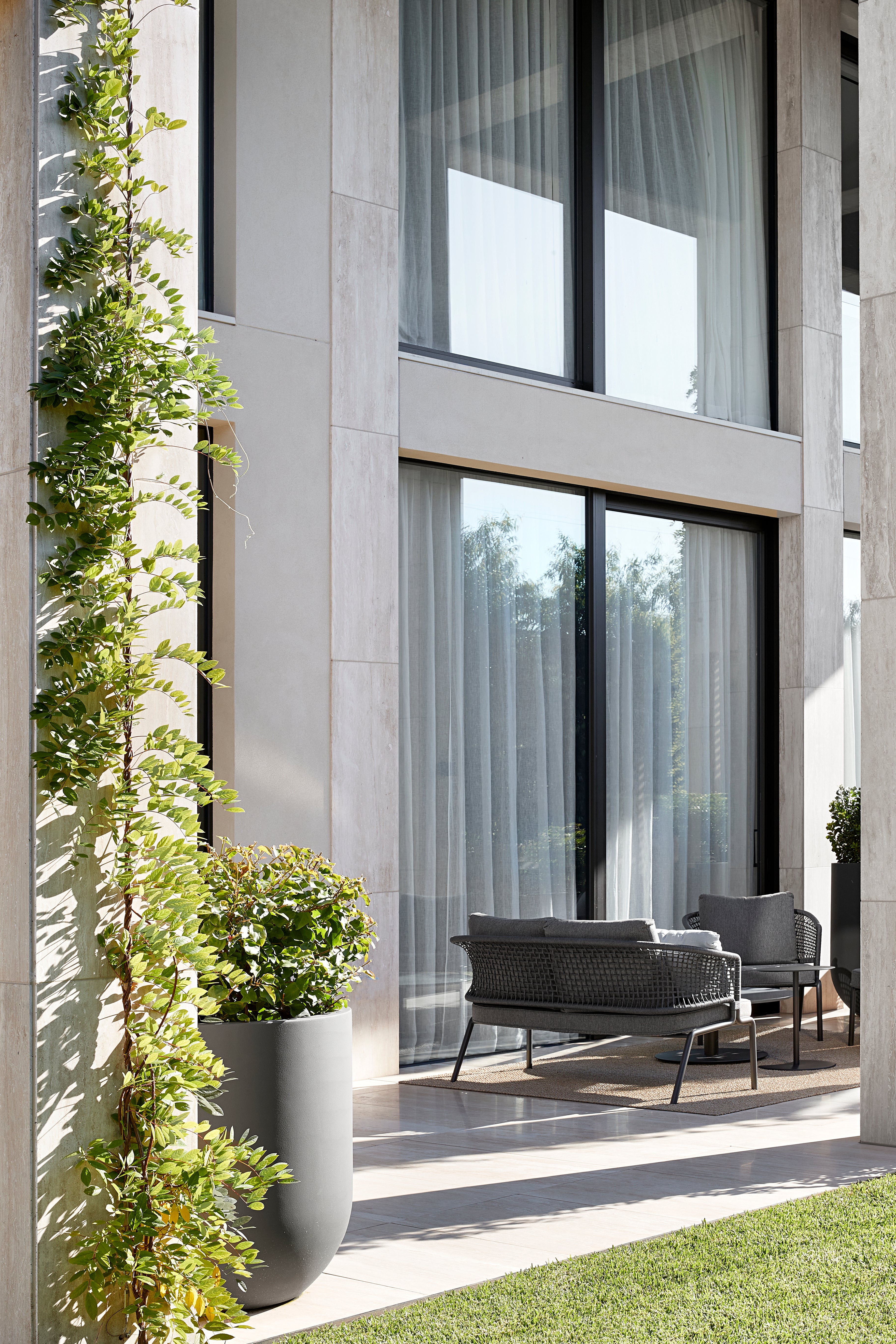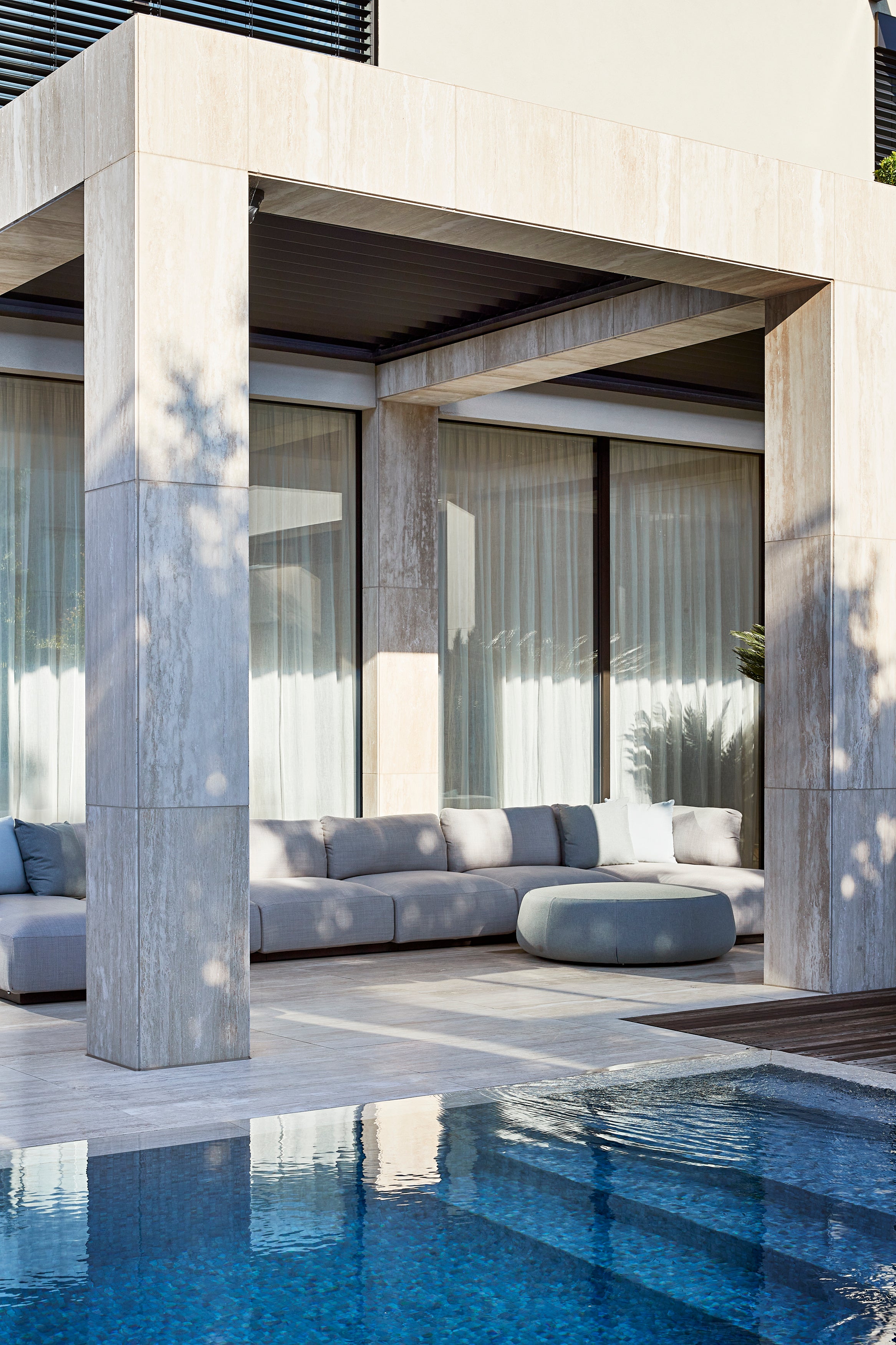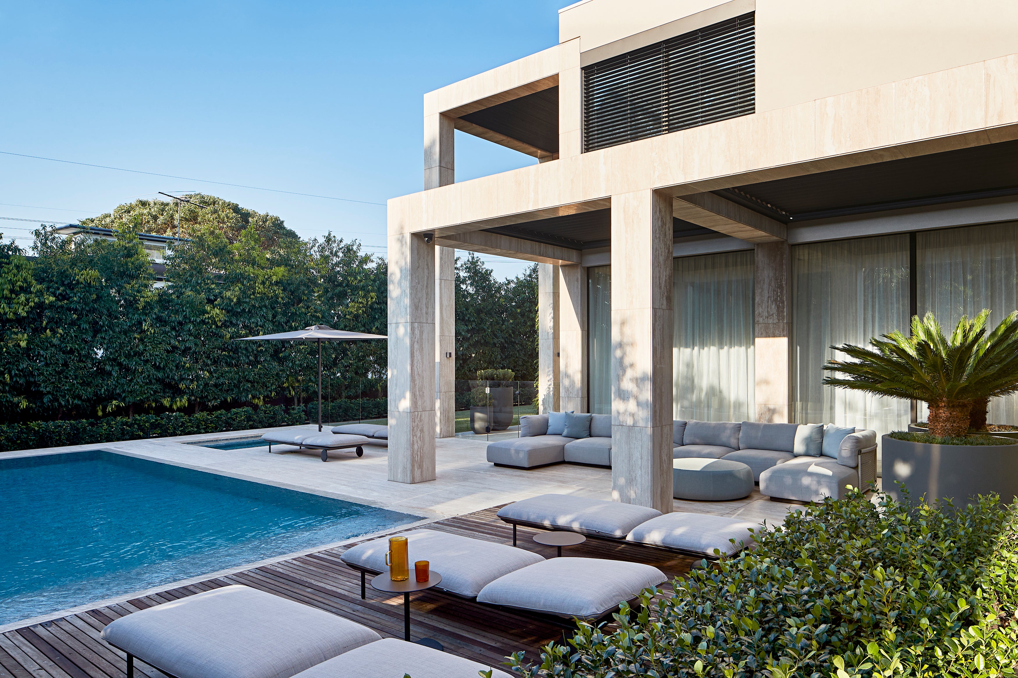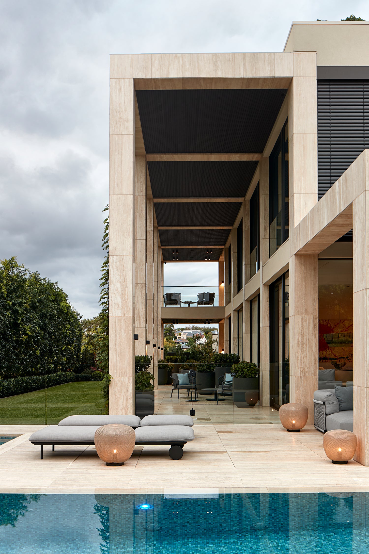 Overlooking the Yarra River on a tree-lined avenue, Vista Grove is a grand travertine-clad residence embodying modern luxury. Renowned landscape designer Jack Merlo integrates interior and exterior seamlessly, enhancing the travertine’s elegance with lush greenery and Cosh Living’s outdoor furniture.