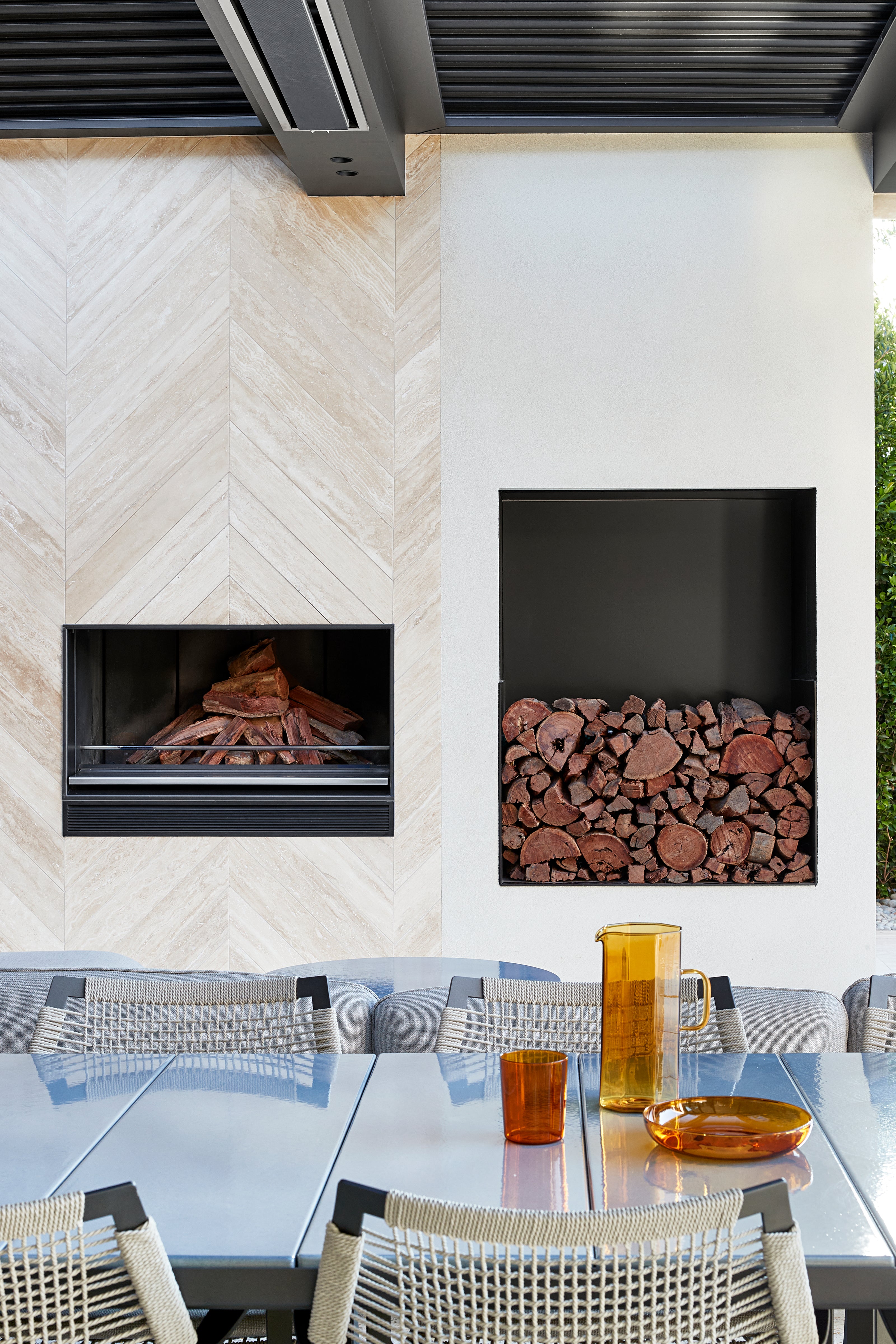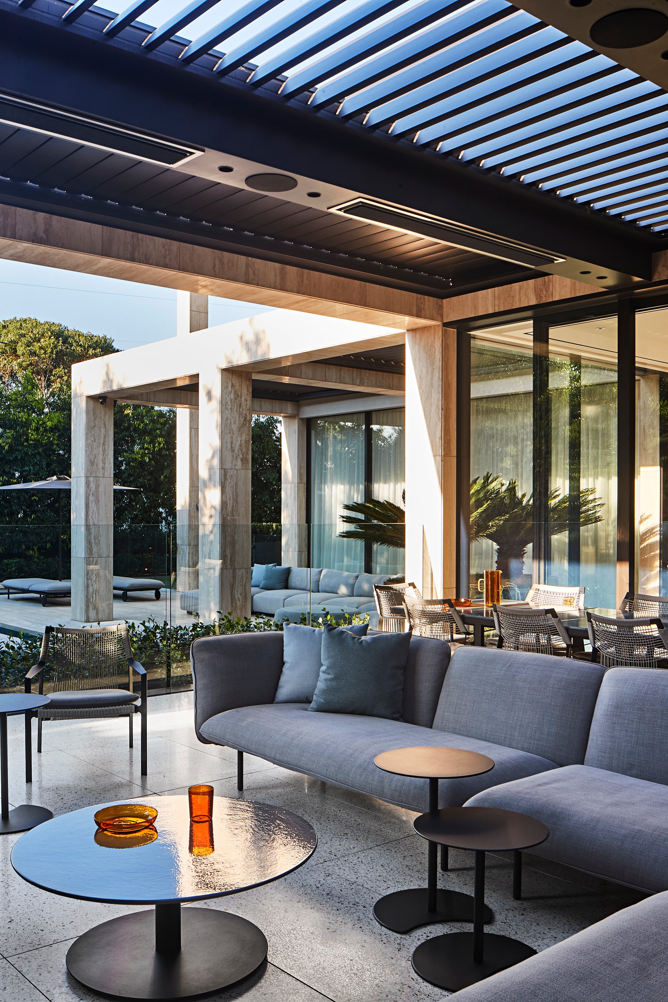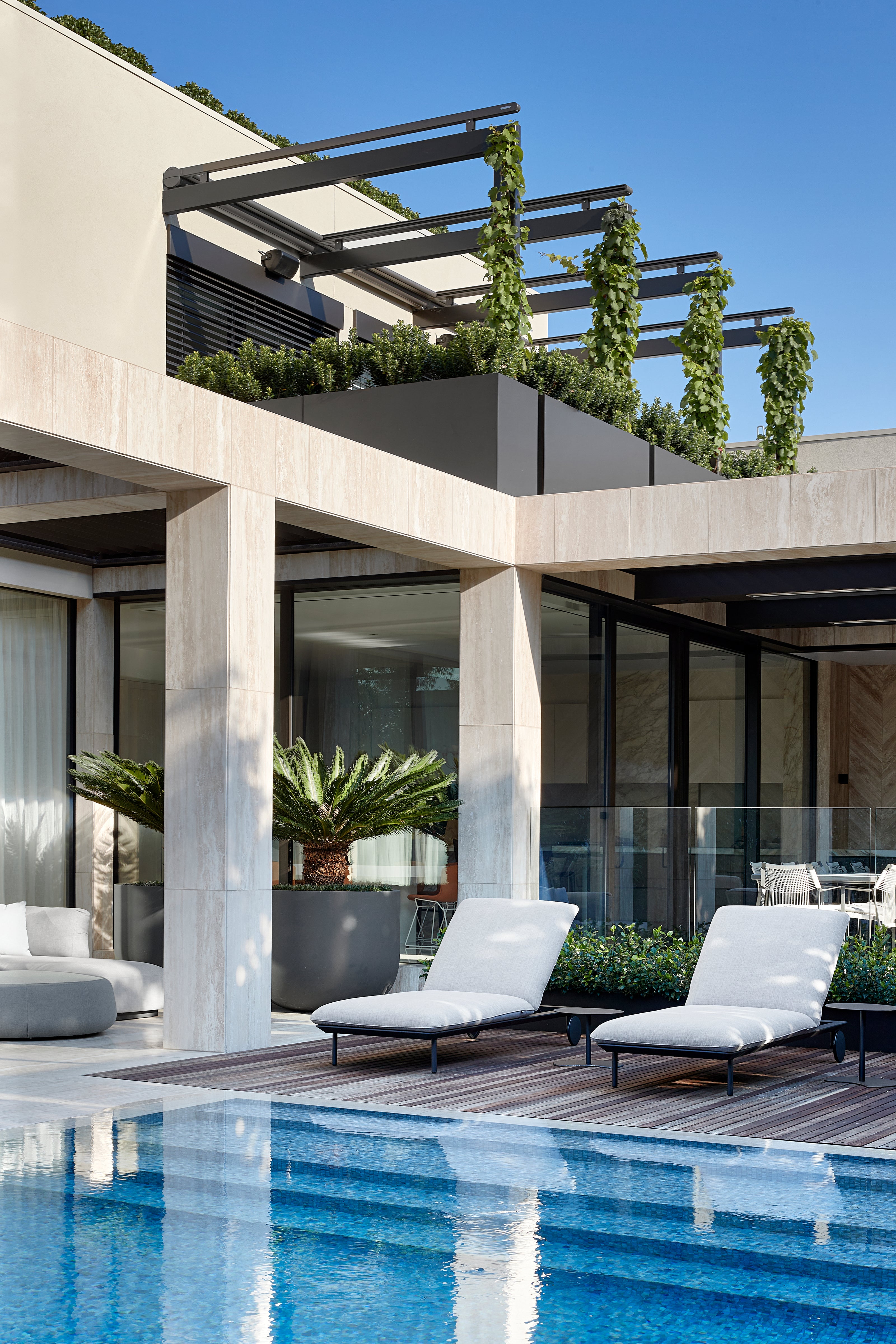 Characterised by large travertine pillars and expansive glass, the Toorak home by Davies Henderson offers garden access from multiple areas. Light travertine contrasts beautifully with dark window frames, creating a cohesive aesthetic. Jack Merlo's landscaping features meticulously designed spaces with lush greenery and touches of blush pink florals, complemented by Cosh Living's furniture. The outdoor areas, ideal for family gatherings, feature high-end pieces from Tribu and Kett, including dining sets, lounge pieces, and poolside furnishings.