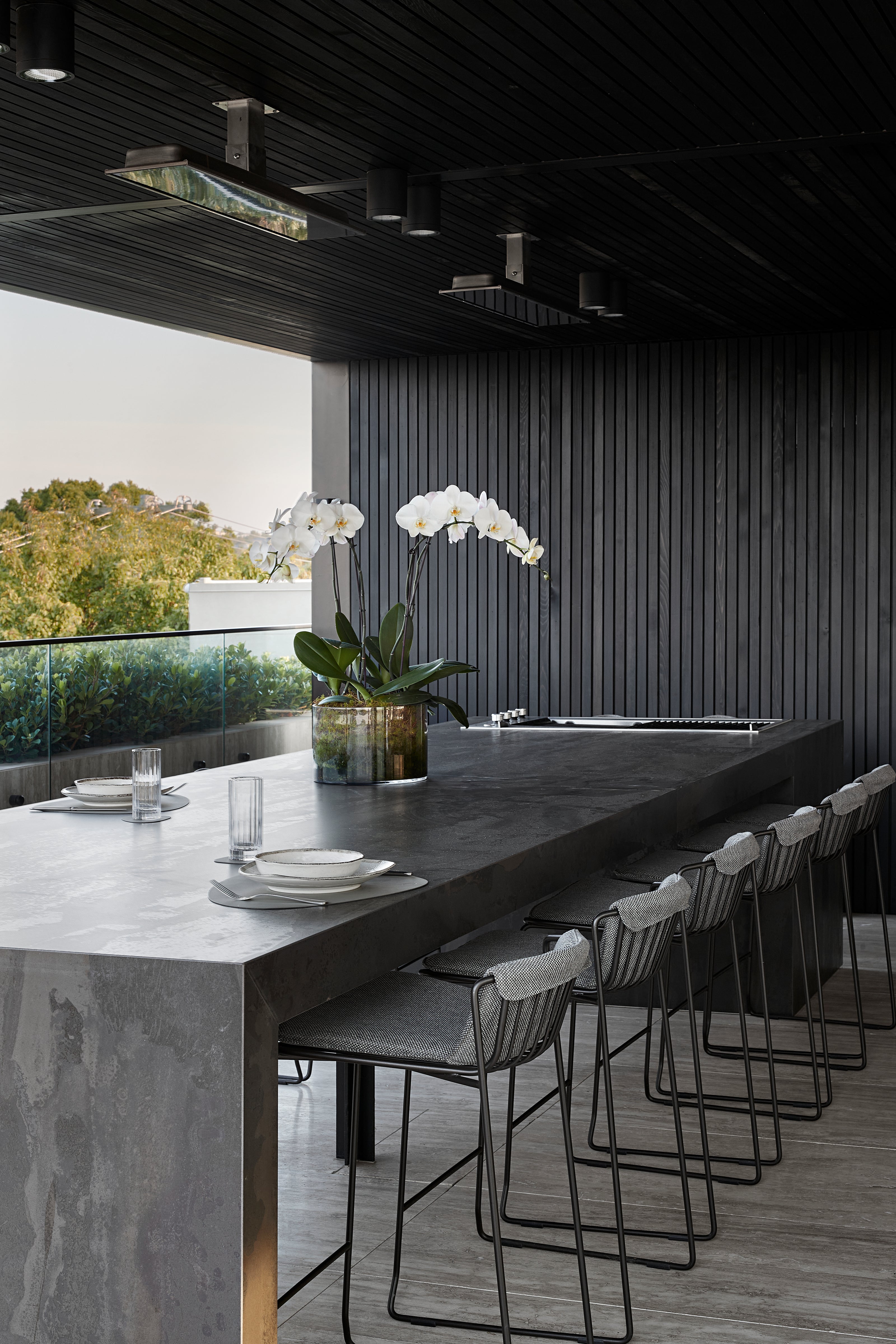 The Contour sofa and lounge chair set offers an intimate morning sun spot, while Kett Furniture's Wye barstools on the balcony overlook gumtrees and the Yarra River. Accessories like drop-side tables and Monsieur Tricot lighting enhance outdoor ambiance. Cosh Living’s durable outdoor fabrics resist fading, mould, and mildew, ensuring longevity in any weather, maintaining quality and charm for projects of this calibre. Vista Grove epitomises modern luxury, offering a serene retreat with sophisticated architecture, luxurious Cosh Living furnishings, and Jack Merlo's exquisite outdoor spaces—a perfect blend of elegance and relaxation.