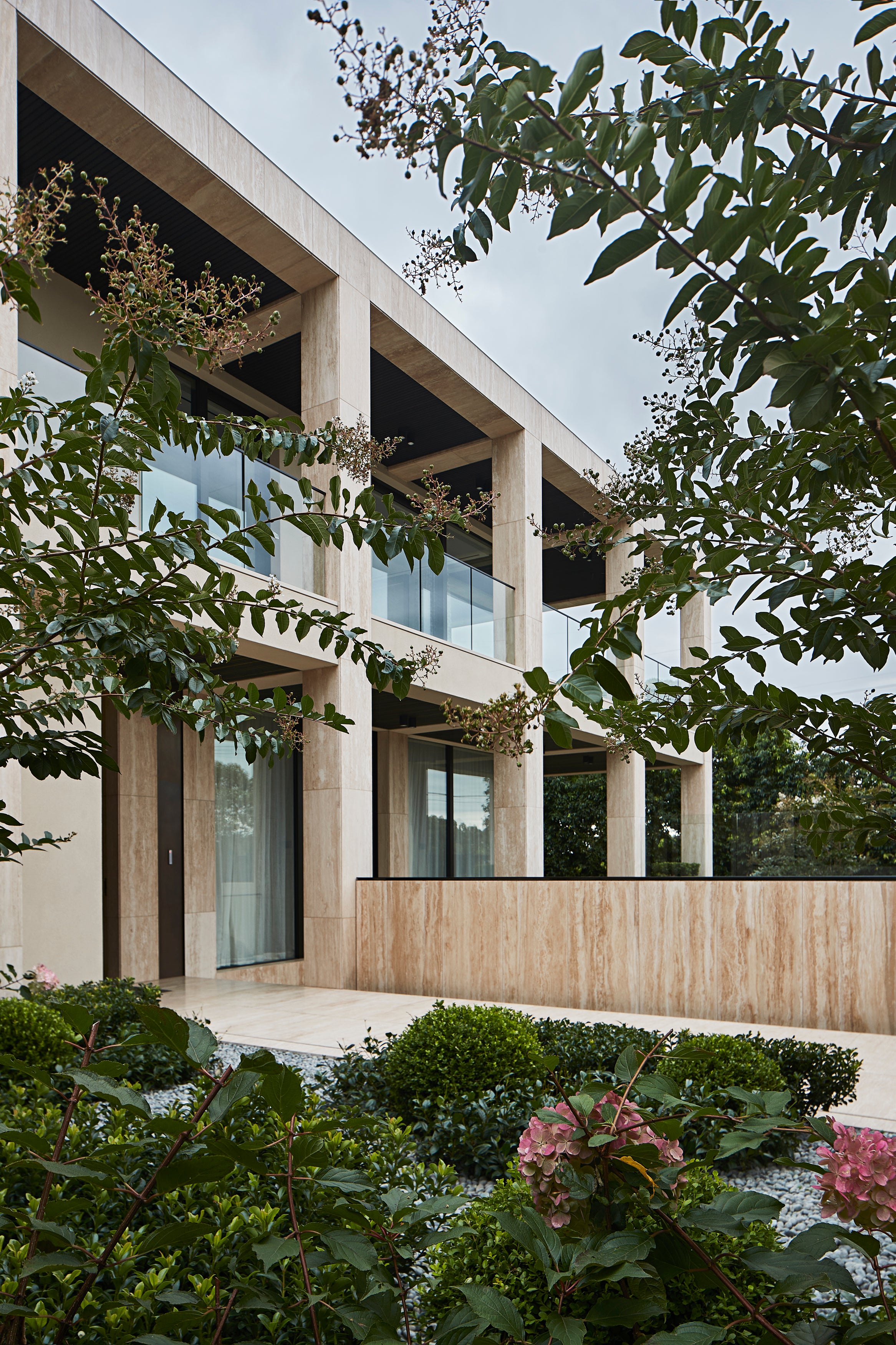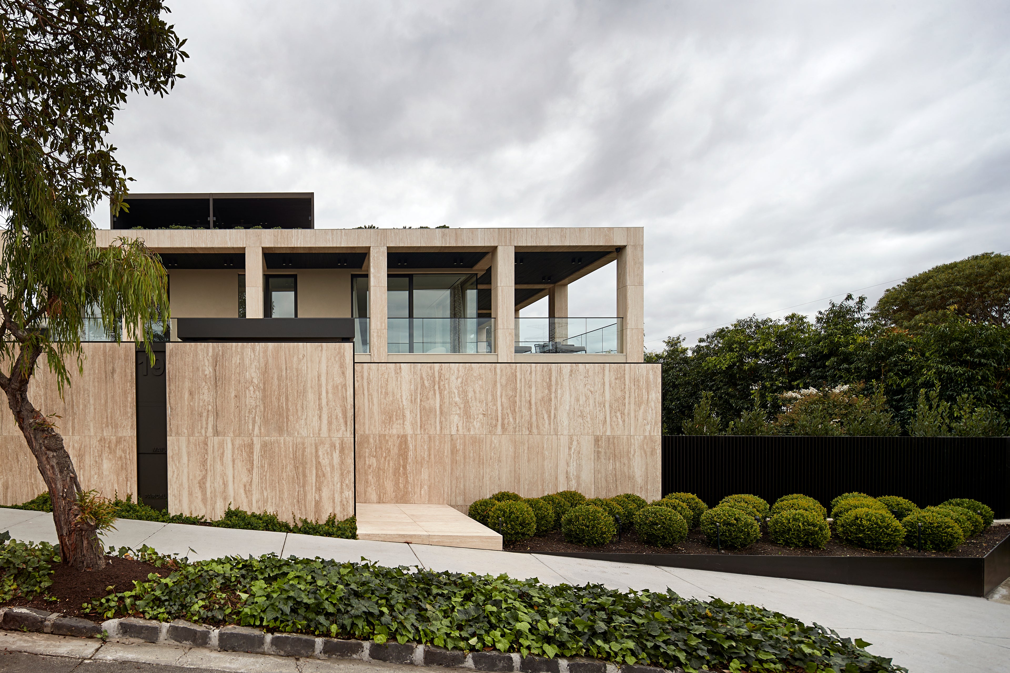 A Toorak home with travertine, glass, and meticulous landscaping.